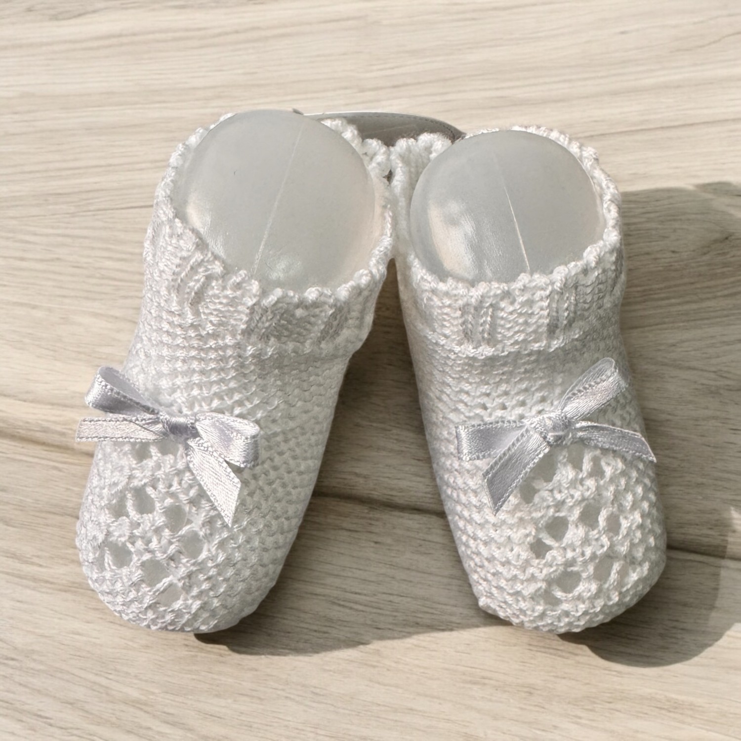 Made in summer knit with a pretty lace trim and satin bow. They are one size fits most for use between 0 and 6 months