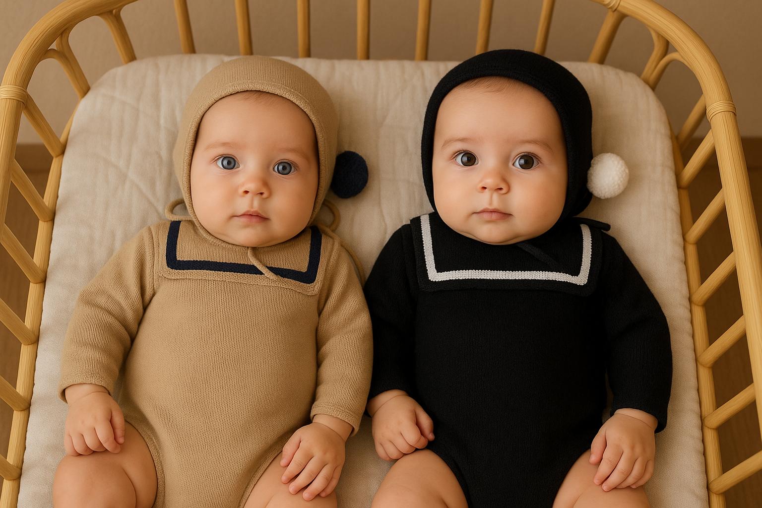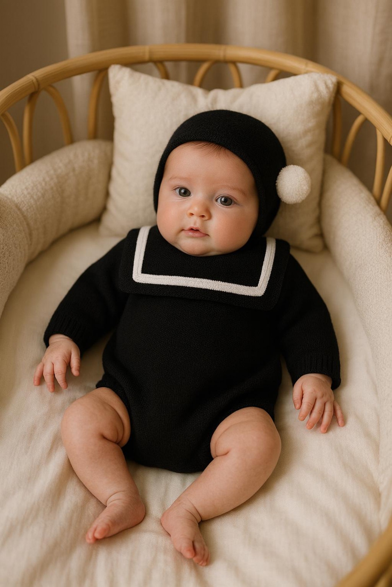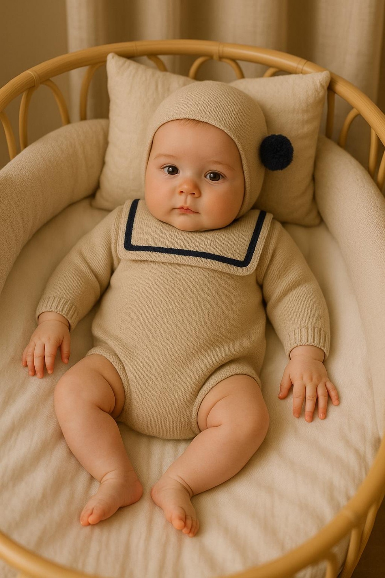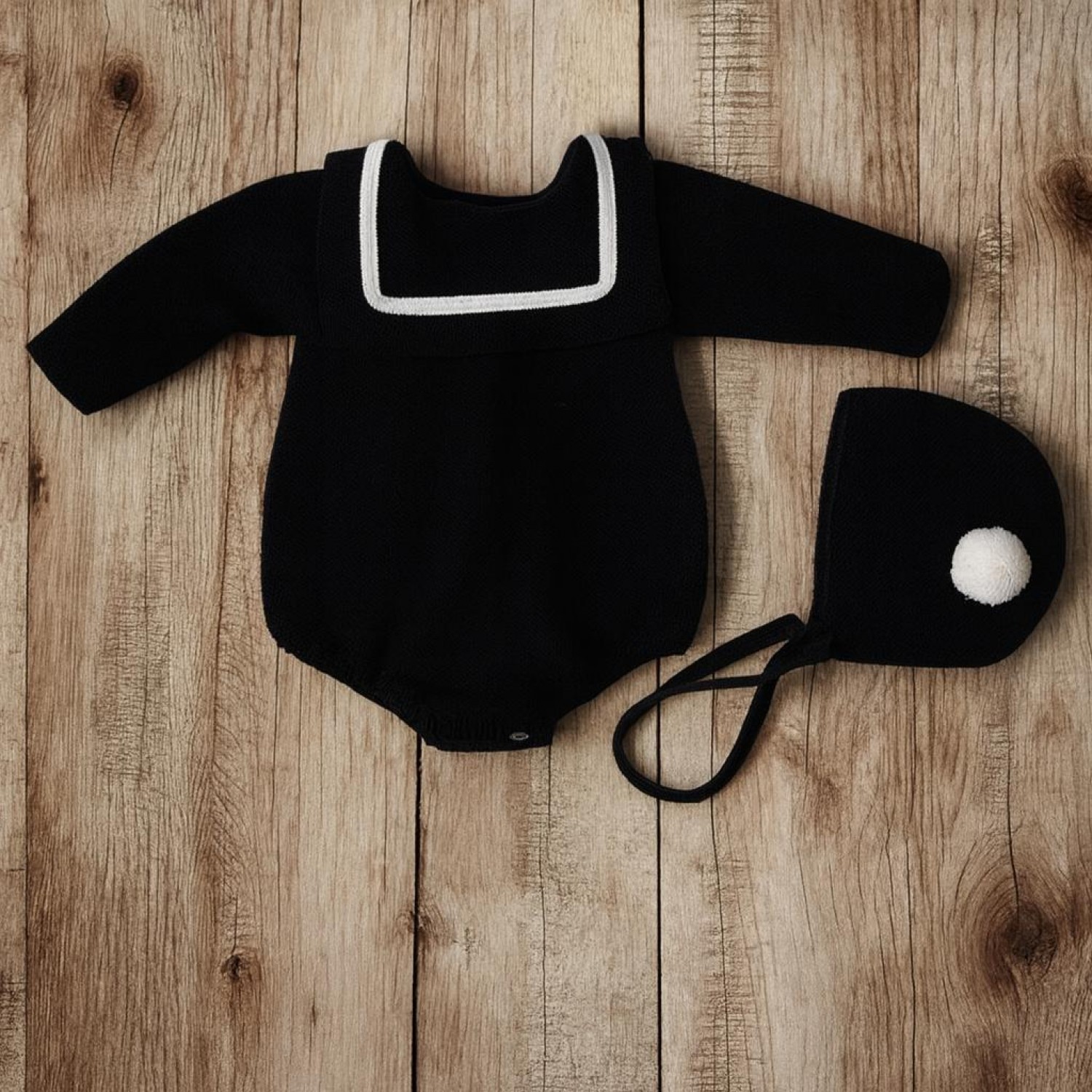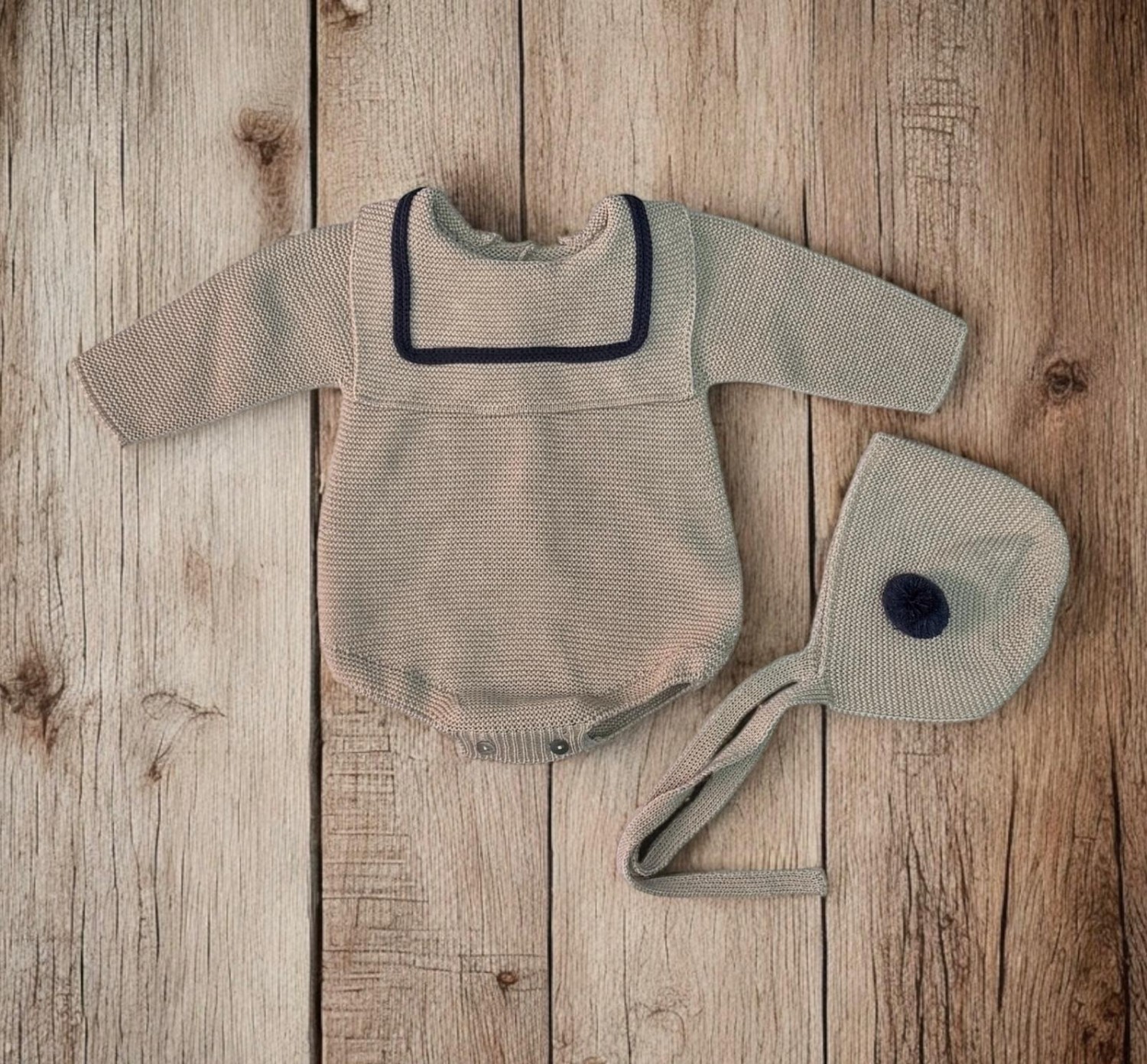 Unisex knitted outfit consisting of a long-sleeved romper with a sailor collar and a matching hat.