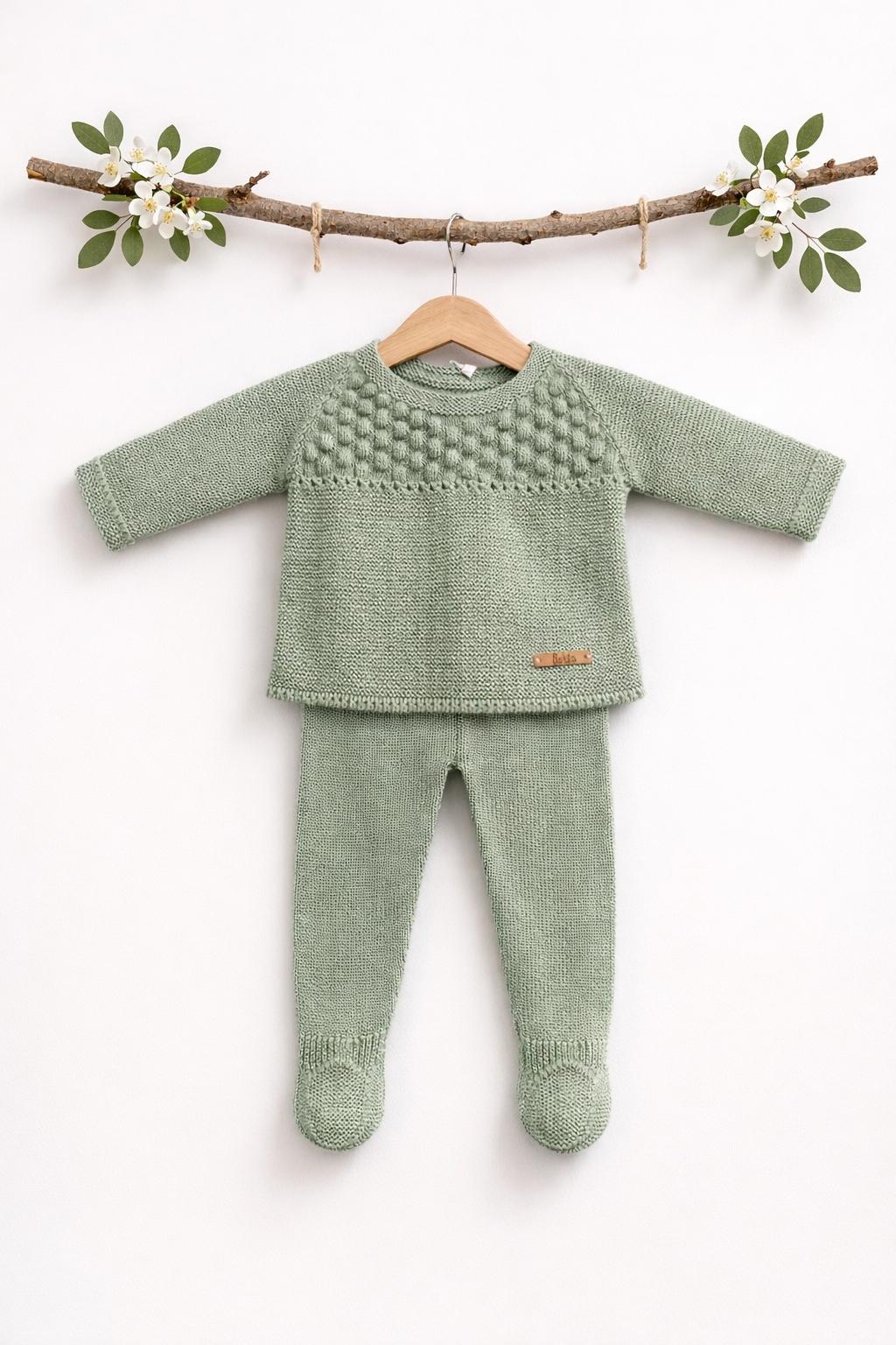 Baby boy's knit set in a soft, muted green, made from organic cotton.