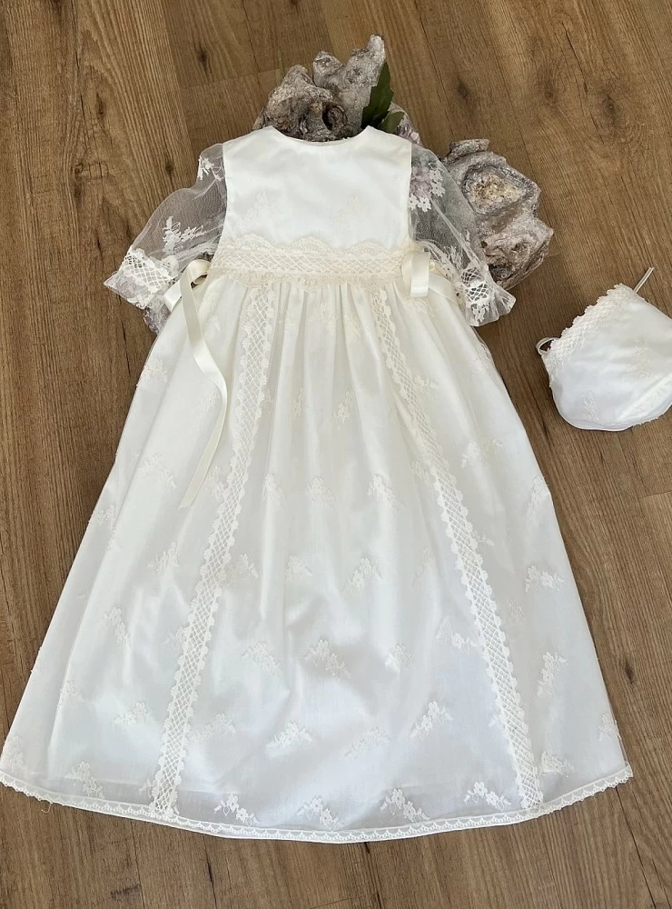 Made of beige embroidered tulle with French sleeves. It has a thread lace to the tone