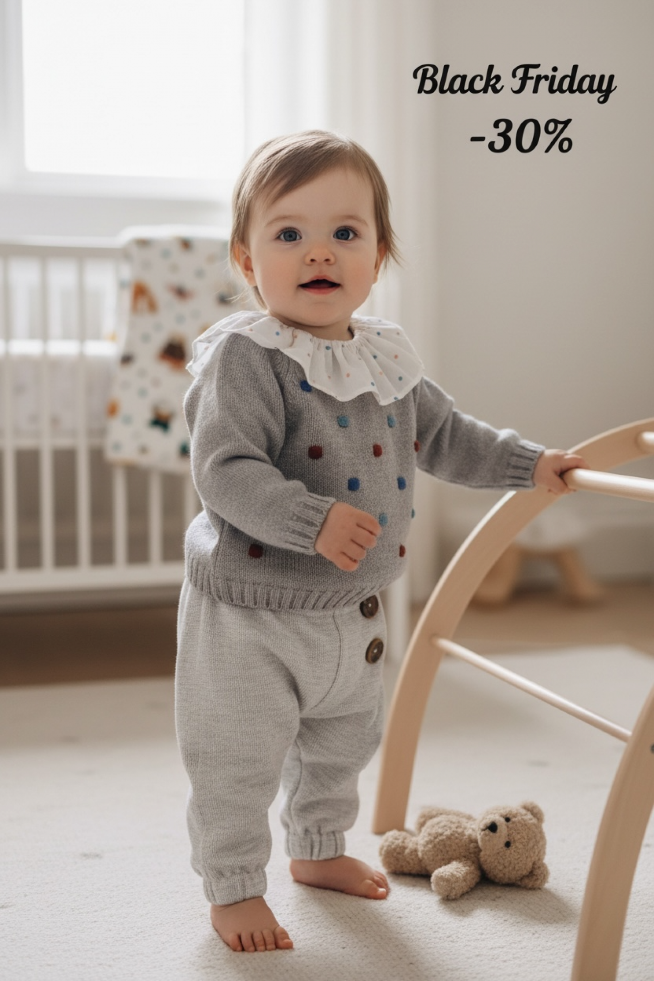 Grey knitted jumper with multi-coloured bobbles. It has an embroidered batiste collar and cotton trousers