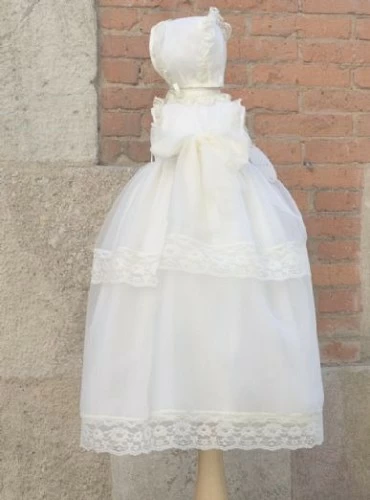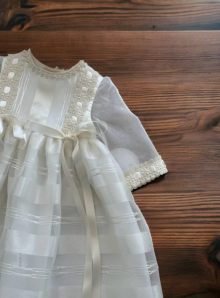 Set made of opaque organza fabric with ribbon loops on the body, sleeves and hood. It has semi-shiny stripes. Very original and pretty