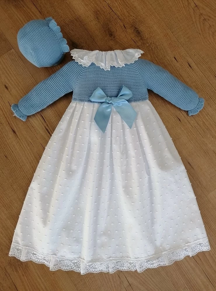 Skirt with body and hood in fine summer knit in pink or powder blue and part of the skirt with the collar in white plumeti. It has white thread lace on the neck and hem.
