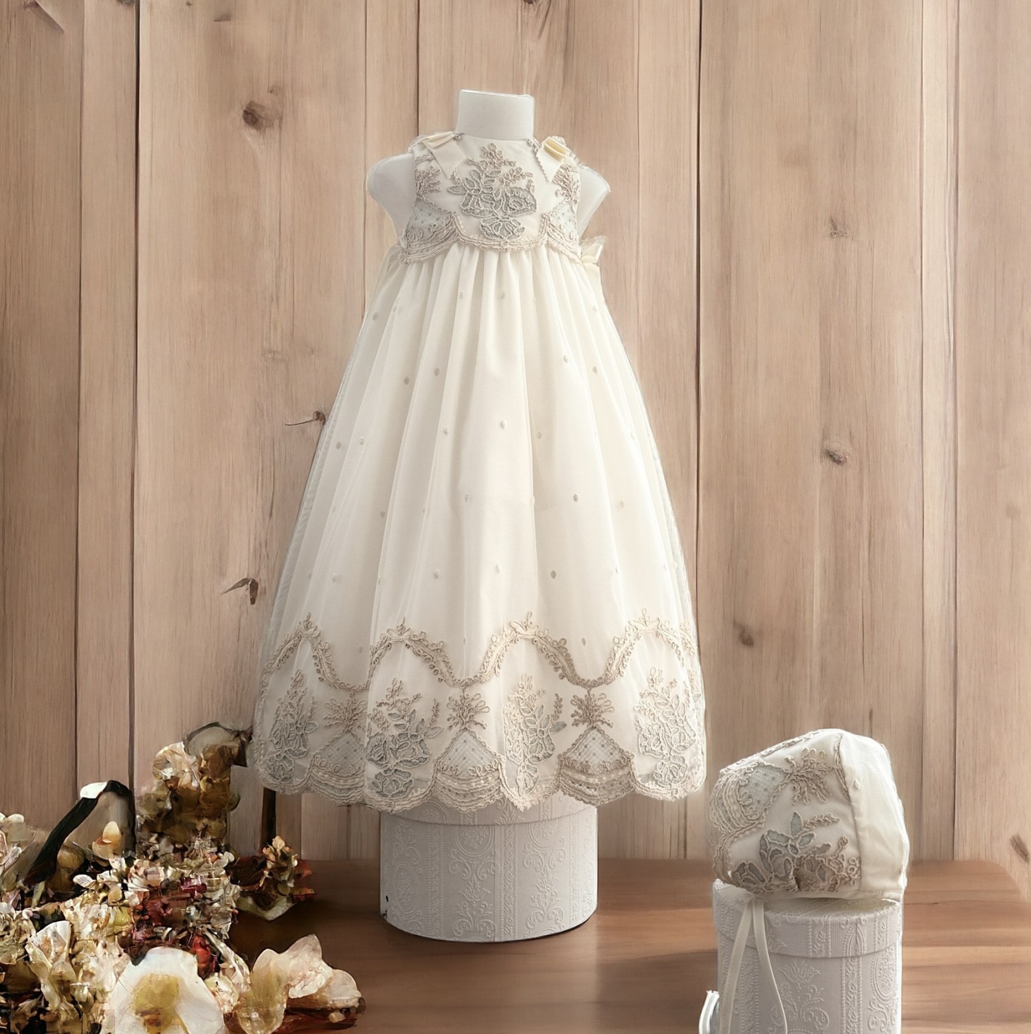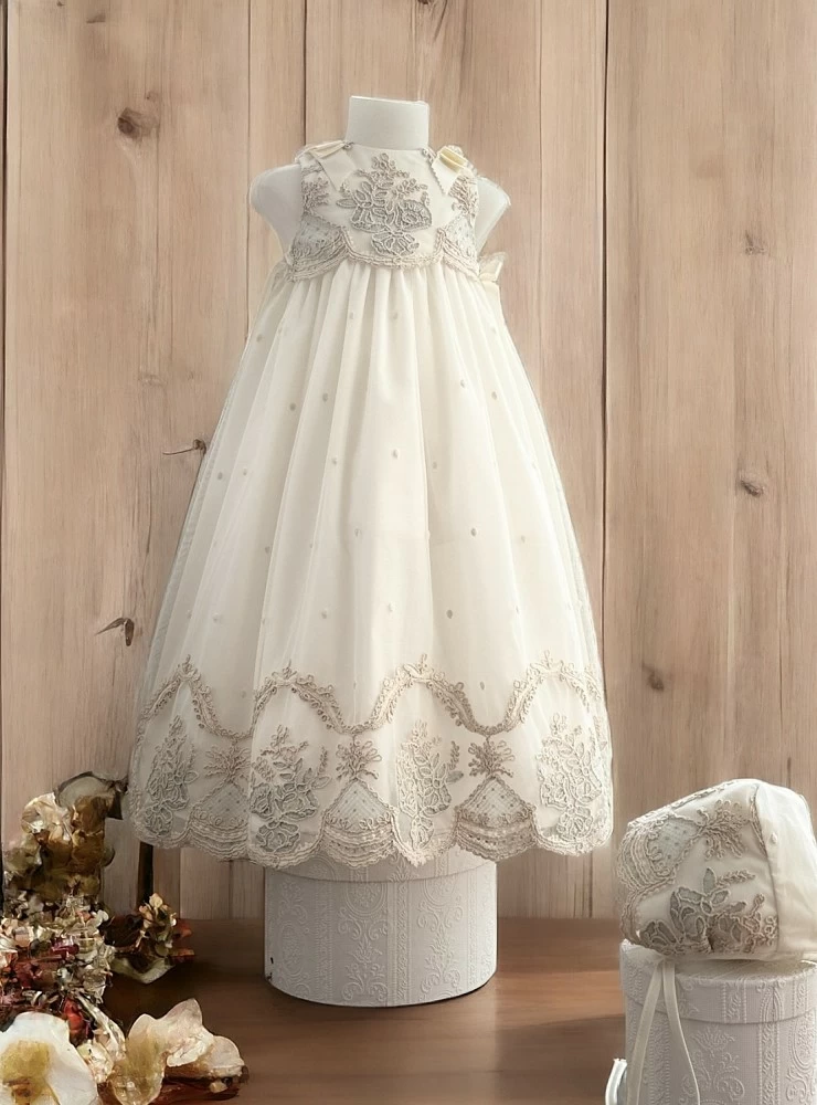 Faldón y capota de bautizo beige unisex. dos tallas 3 y 6 m.