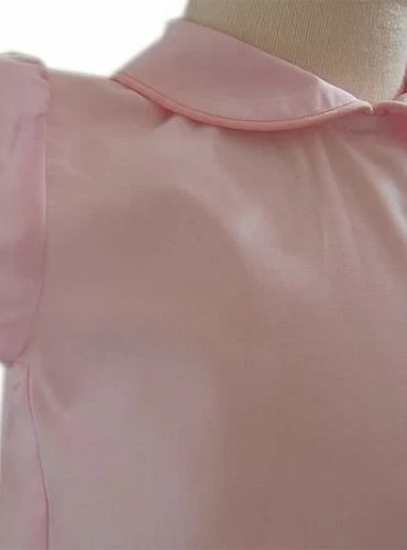 Plumeti combined with cotton on the diaper side. It has a ruffled collar and short sleeves