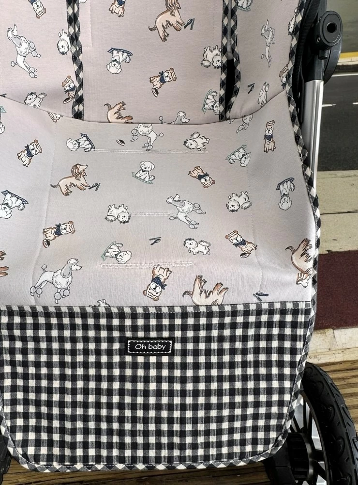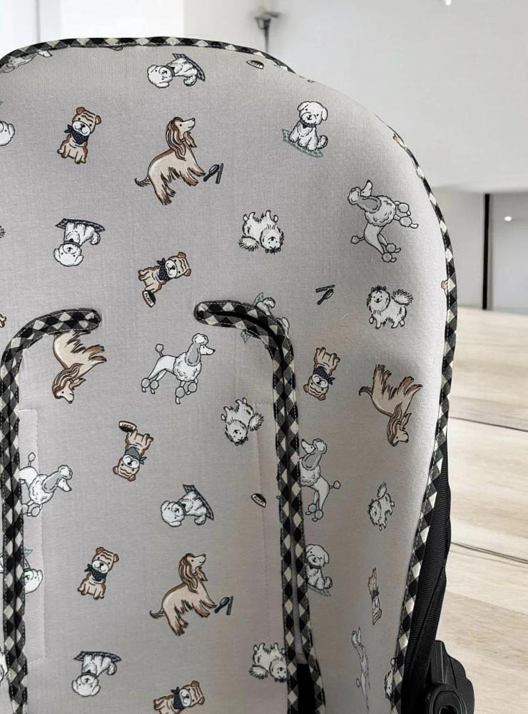 Made of cotton fabric in three colours with a dog print, it has matching gingham details.