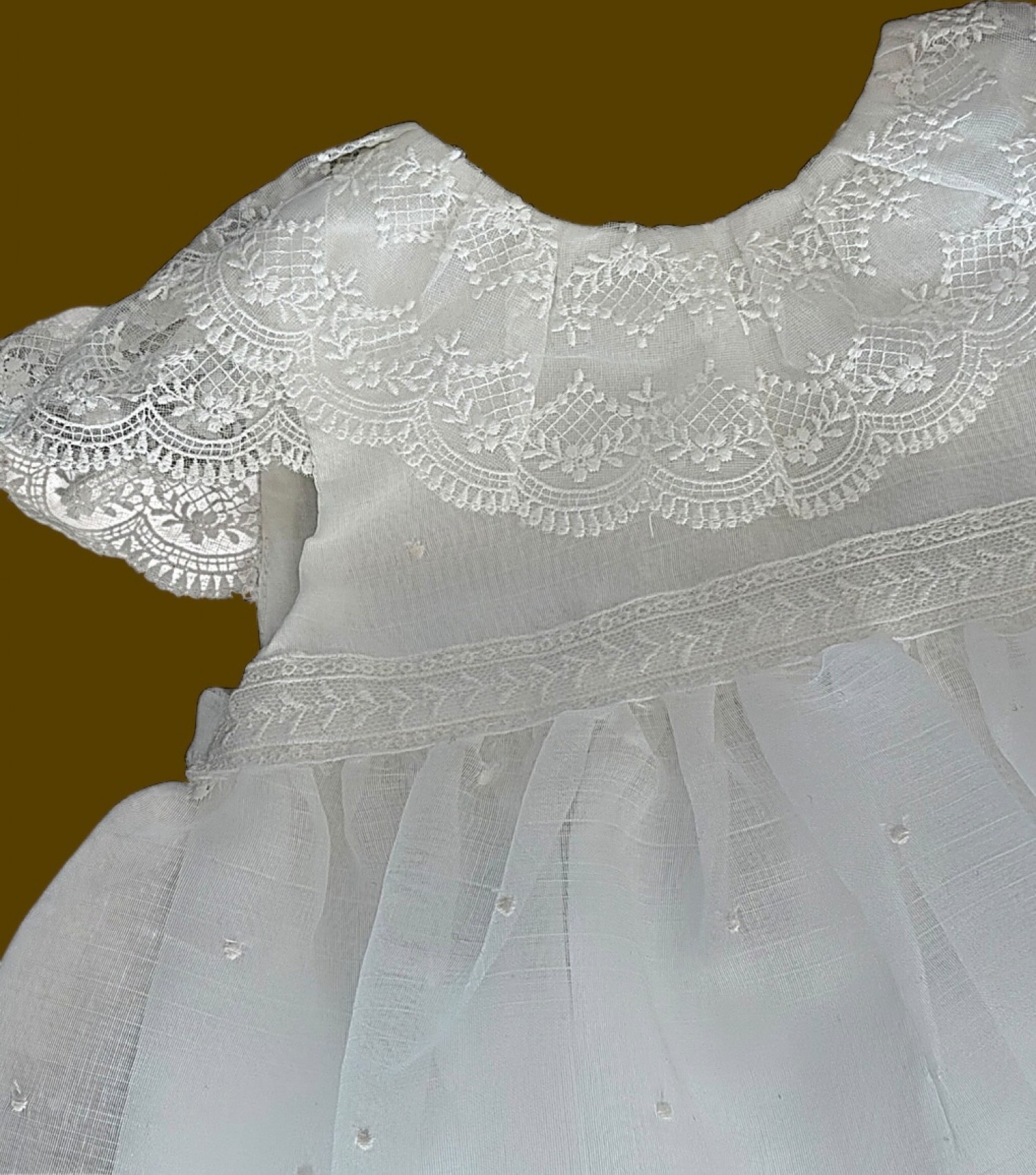 The dress features a wide, ruffled collar embroidered with floral lace, finished with a scalloped edge and a very delicate openwork design that beautifully frames the shoulders.