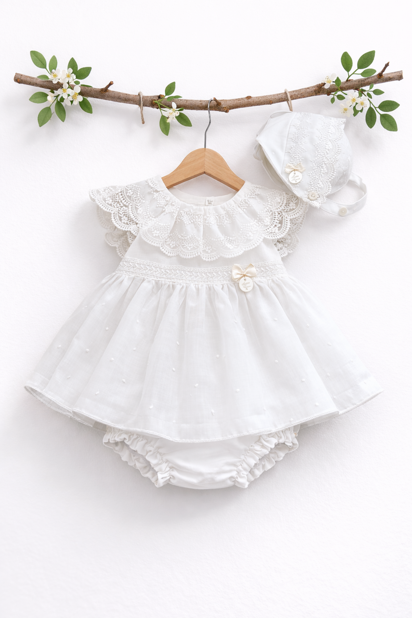 Matching bloomers in the same off-white fabric, with gathered legs and soft elastic for a comfortable fit.
