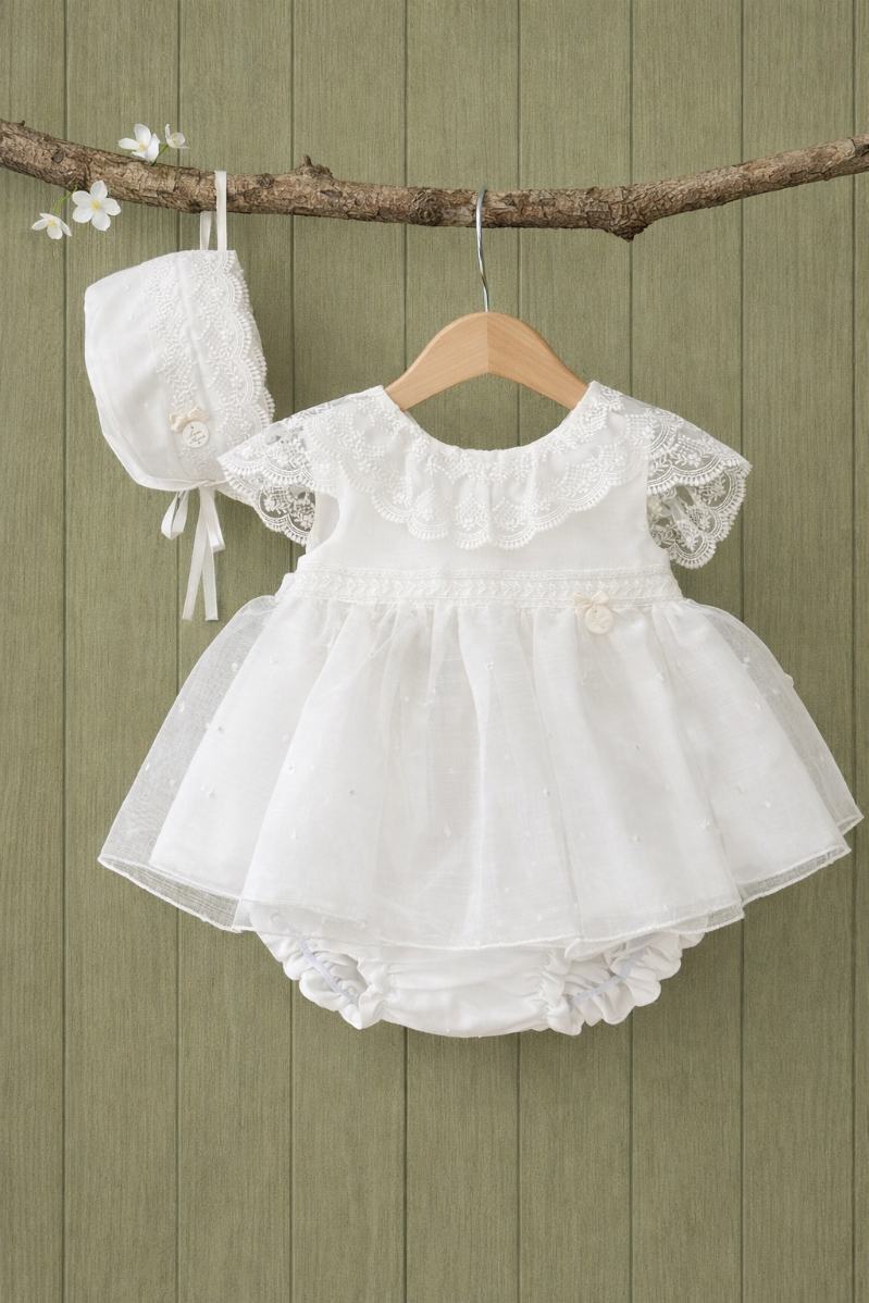 Three-piece set for girls, consisting of a dress, bloomers, and bonnet in delicate off-white muslin fabric, with small raised embroidery scattered throughout for added texture and elegance.