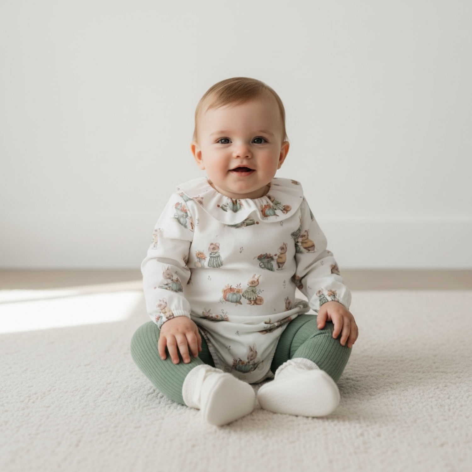 Made of raw viella with a cute and simple squirrel print. It features a ruffled collar.
