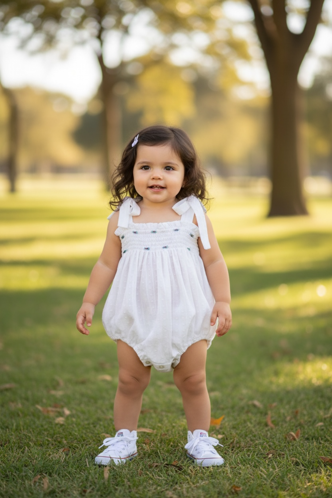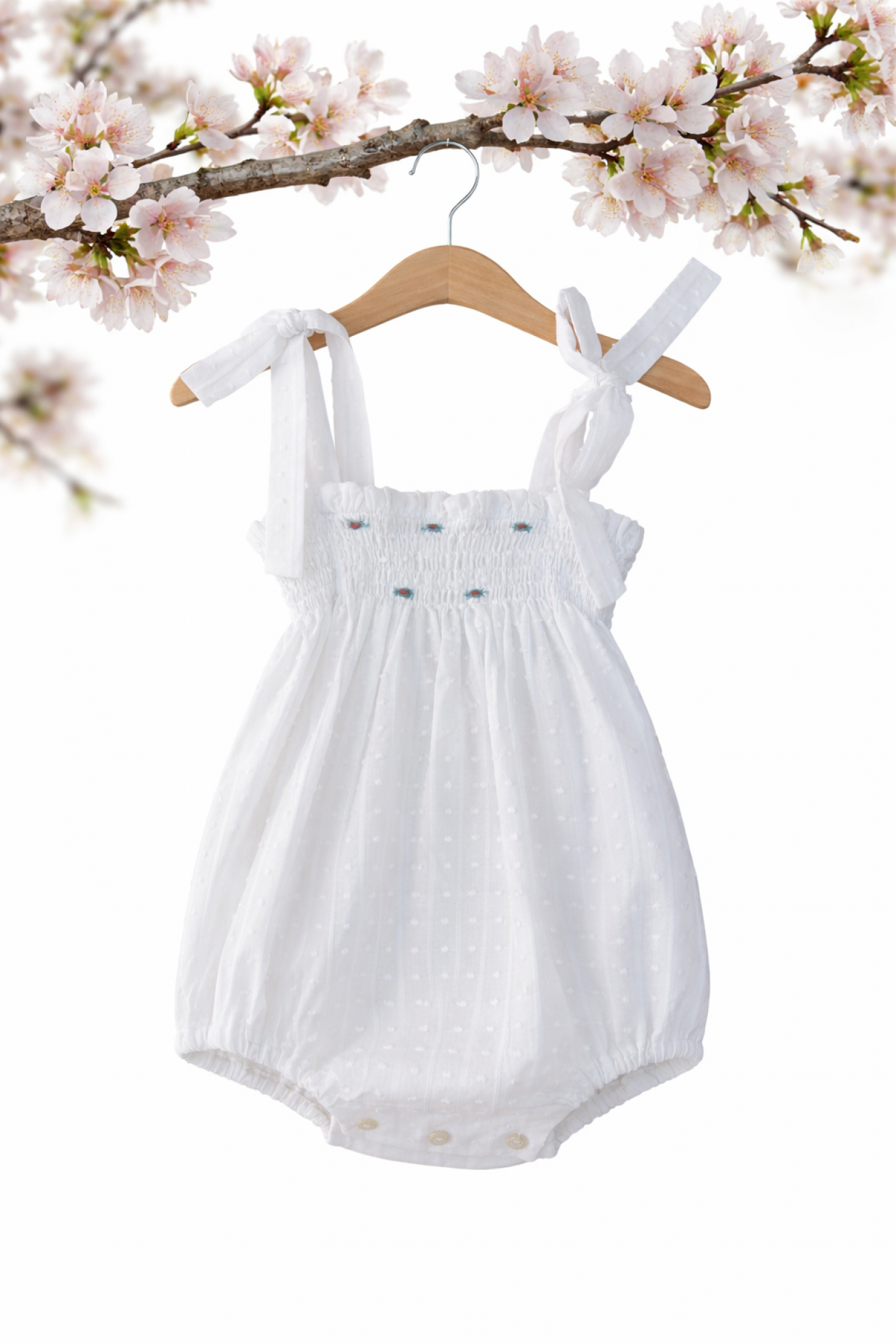 Baby romper in delicate and lightweight white plumeti fabric, ideal for warmer days.