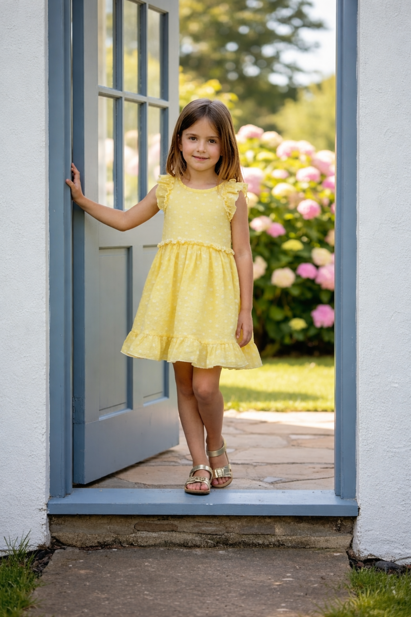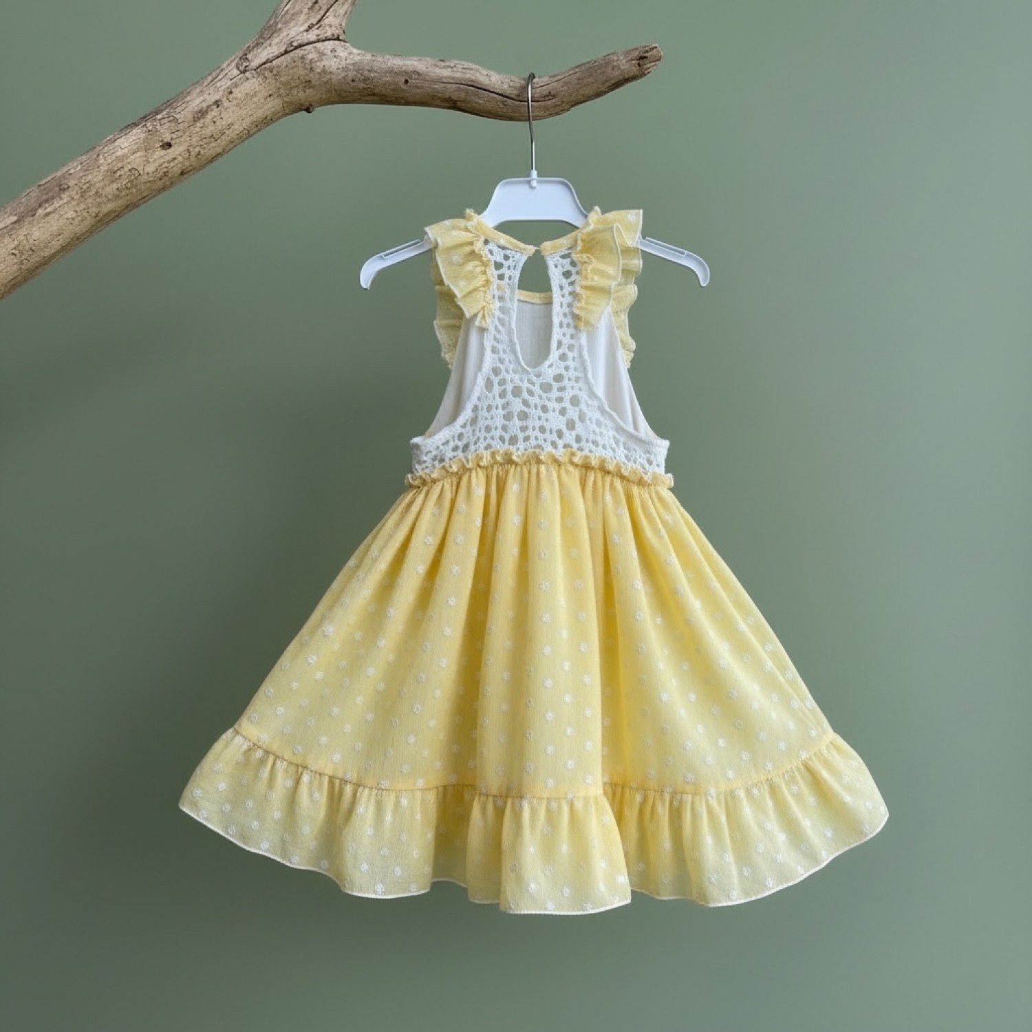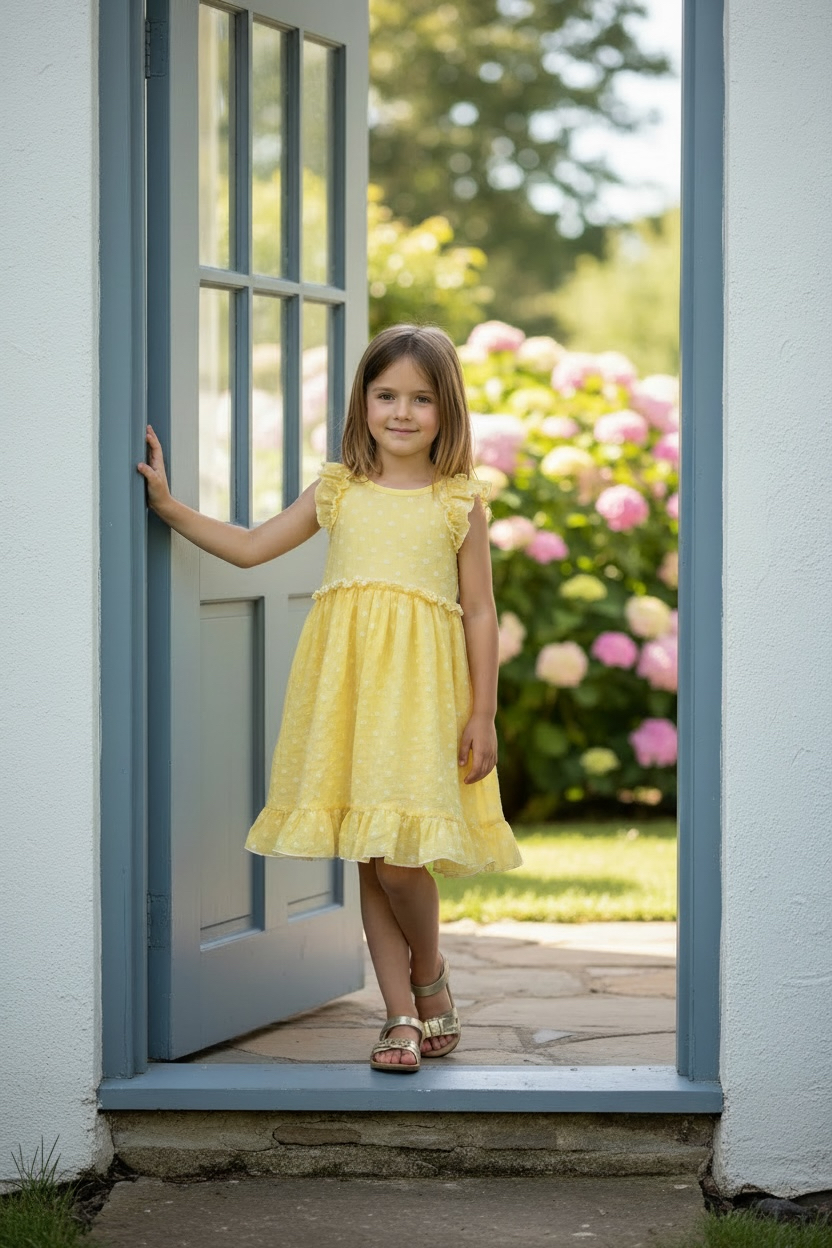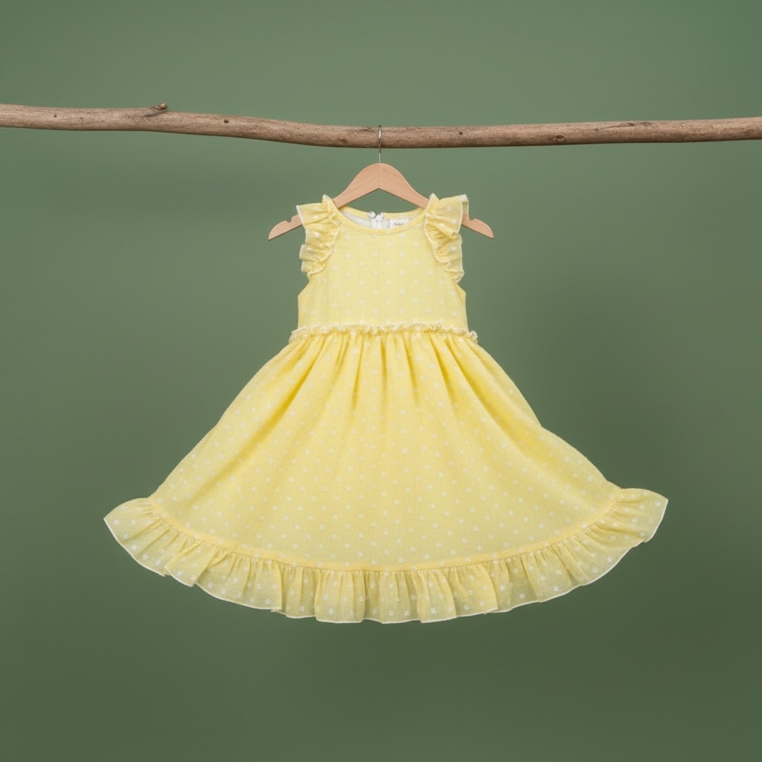 Girls' dress in yellow plumeti fabric with white polka dots, super cheerful and perfect for spring and summer days. This sleeveless design features a ruffle at the shoulders and a fitted waist, creating a flattering and comfortable fit. The skirt has a beautiful flare and finishes with a ruffle for an even sweeter look. An ideal dress for walks, celebrations, or everyday wear, made from a lightweight and delicate fabric that's simply irresistible.