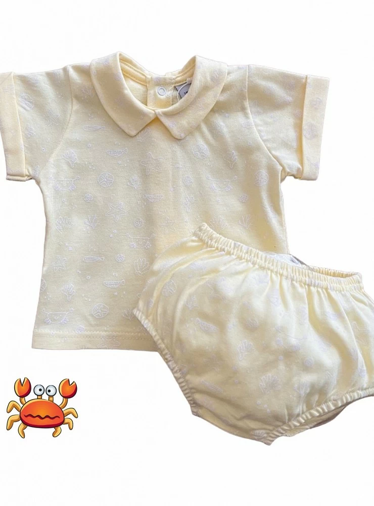 Composed of a polo-neck t-shirt and yellow cotton panties with a seabed print