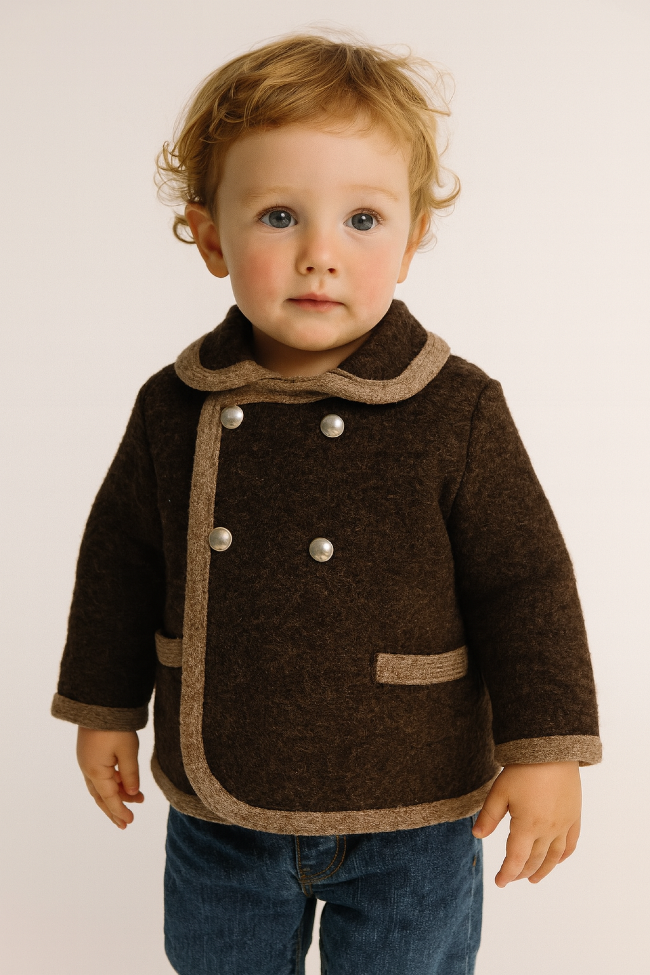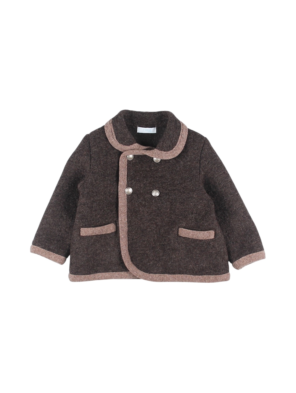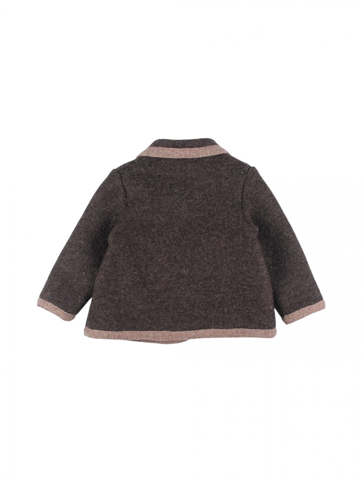 Elegante abrigo cruzado austriaco para niño realizado en paño color chocolate con delicado contraste en tono visón. Presenta cuello redondeado, doble botonadura al frente y bolsillos ribeteados.