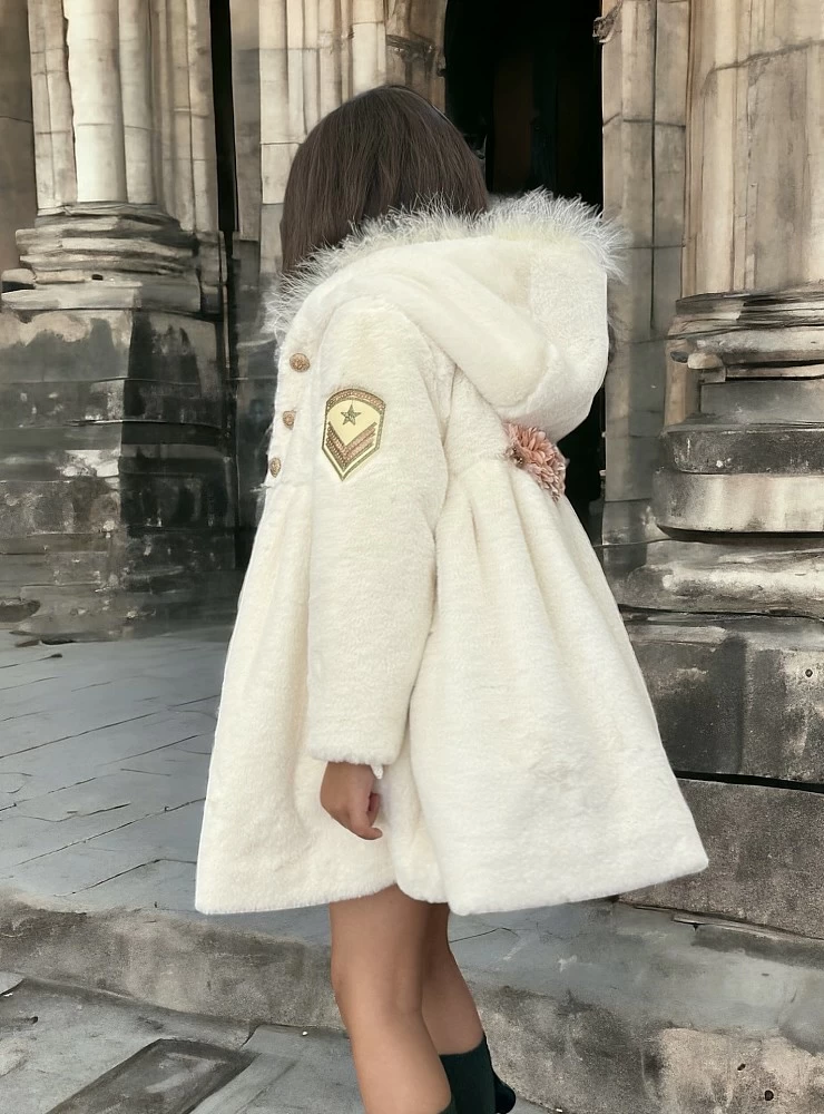 Confeccionado en pelo muy suave color beige con interior de forro tafetán del mismo tono, lleva vuelo y capucha rematada con pelo natural. en la parte trasera lleva un bonito tocado en flores rosa empolvado. Es una maravilla