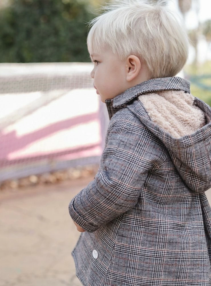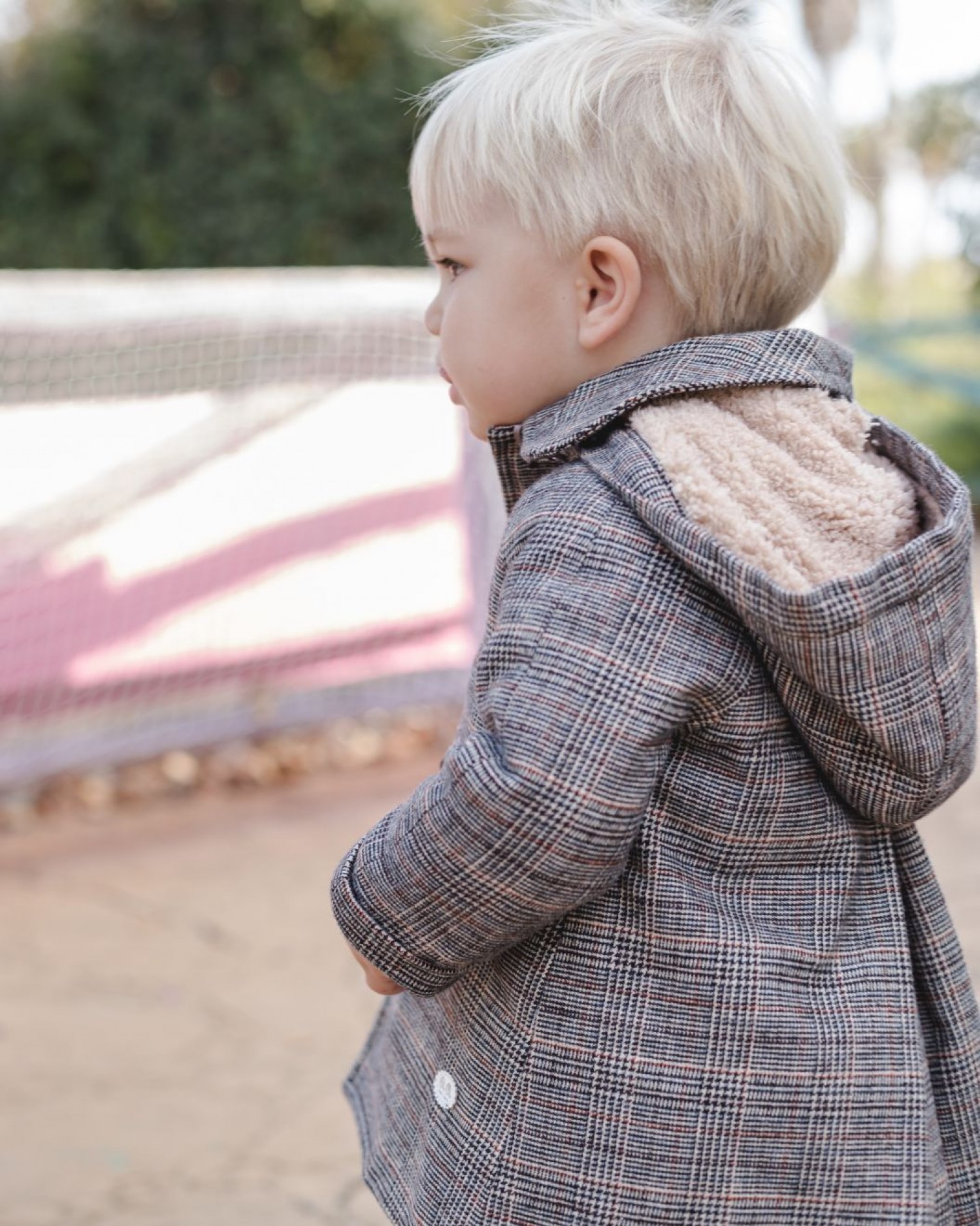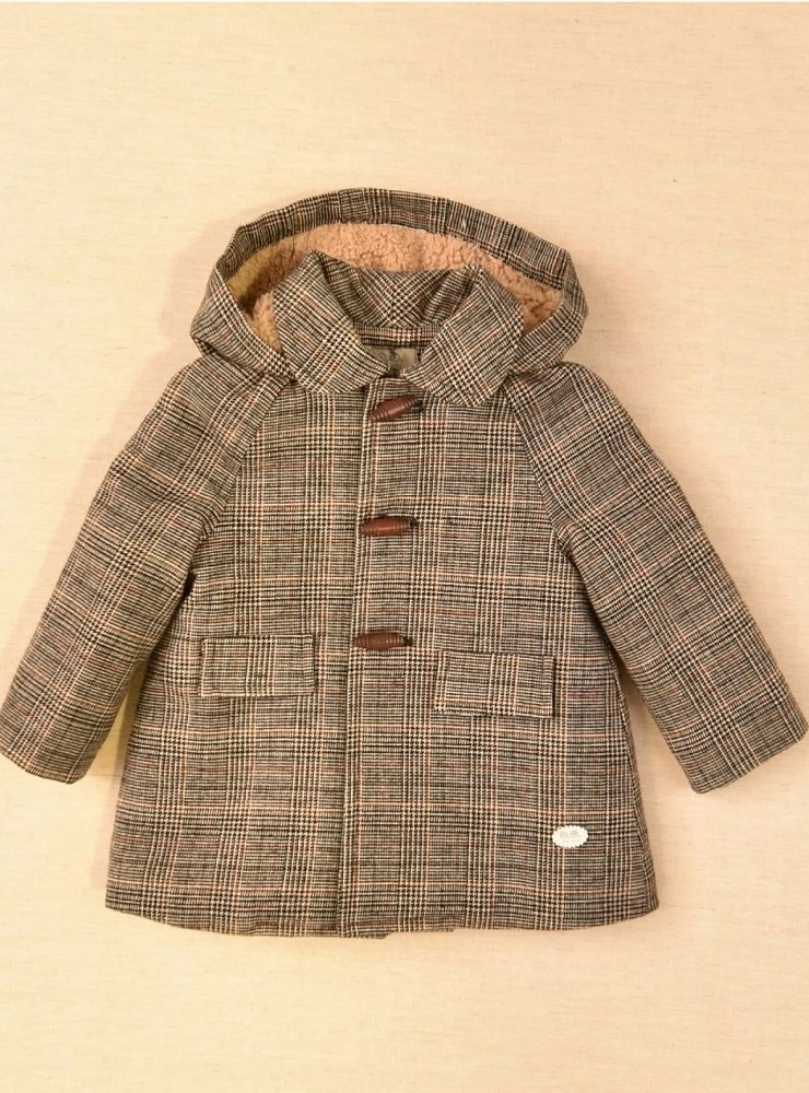 El abrigo es el típico corte Londinense en cuadros tostados. Lleva botón bellota y capucha forrada en borreguito. El interior del abrigo es acolchado para que se pueda poner fácilmente y no resulte incomodo.