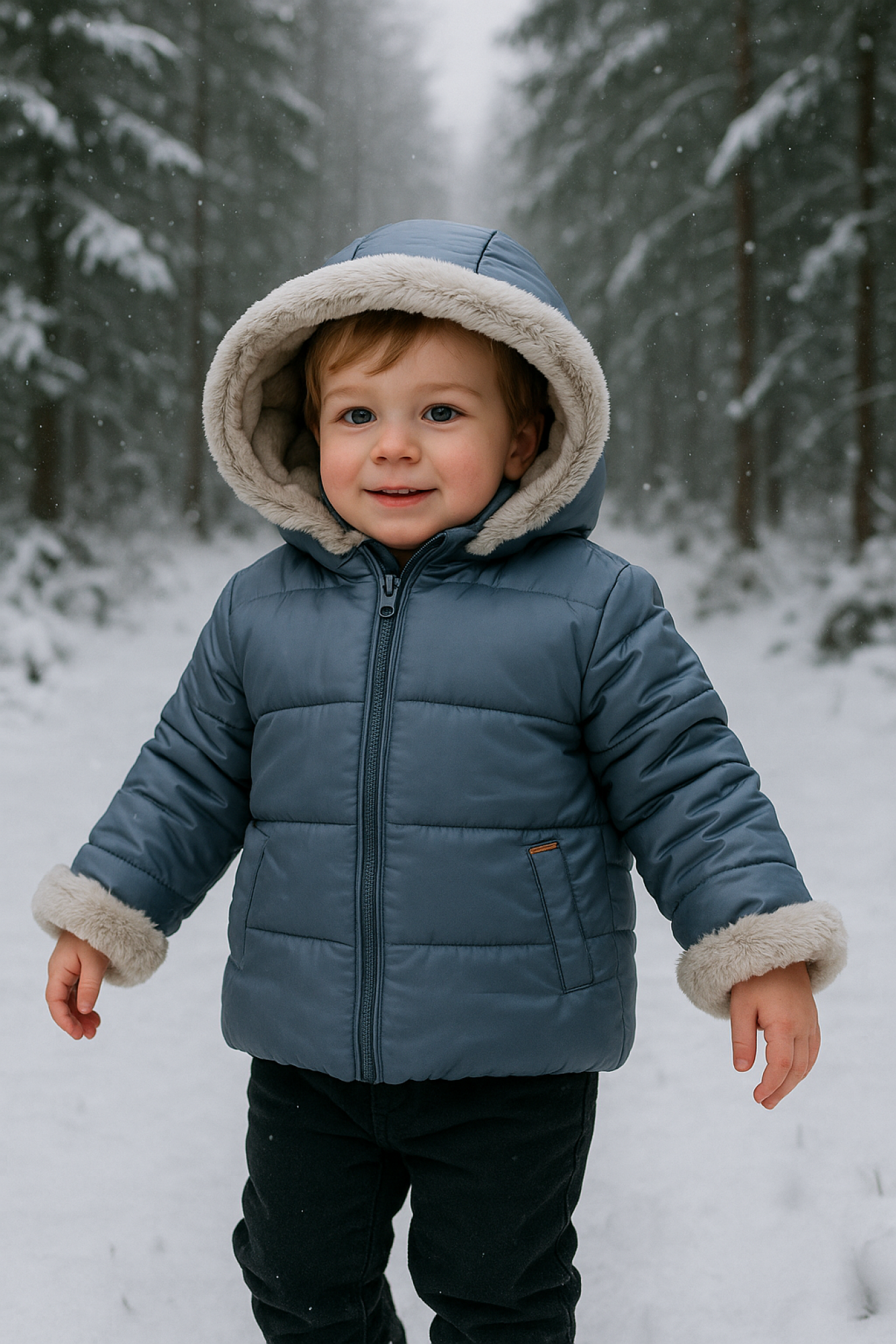 Exterior en tejido acolchado en azul empolvado y el interior pelo gris. Lleva capucha desmontable y cuello bebé para usar de las dos formas.