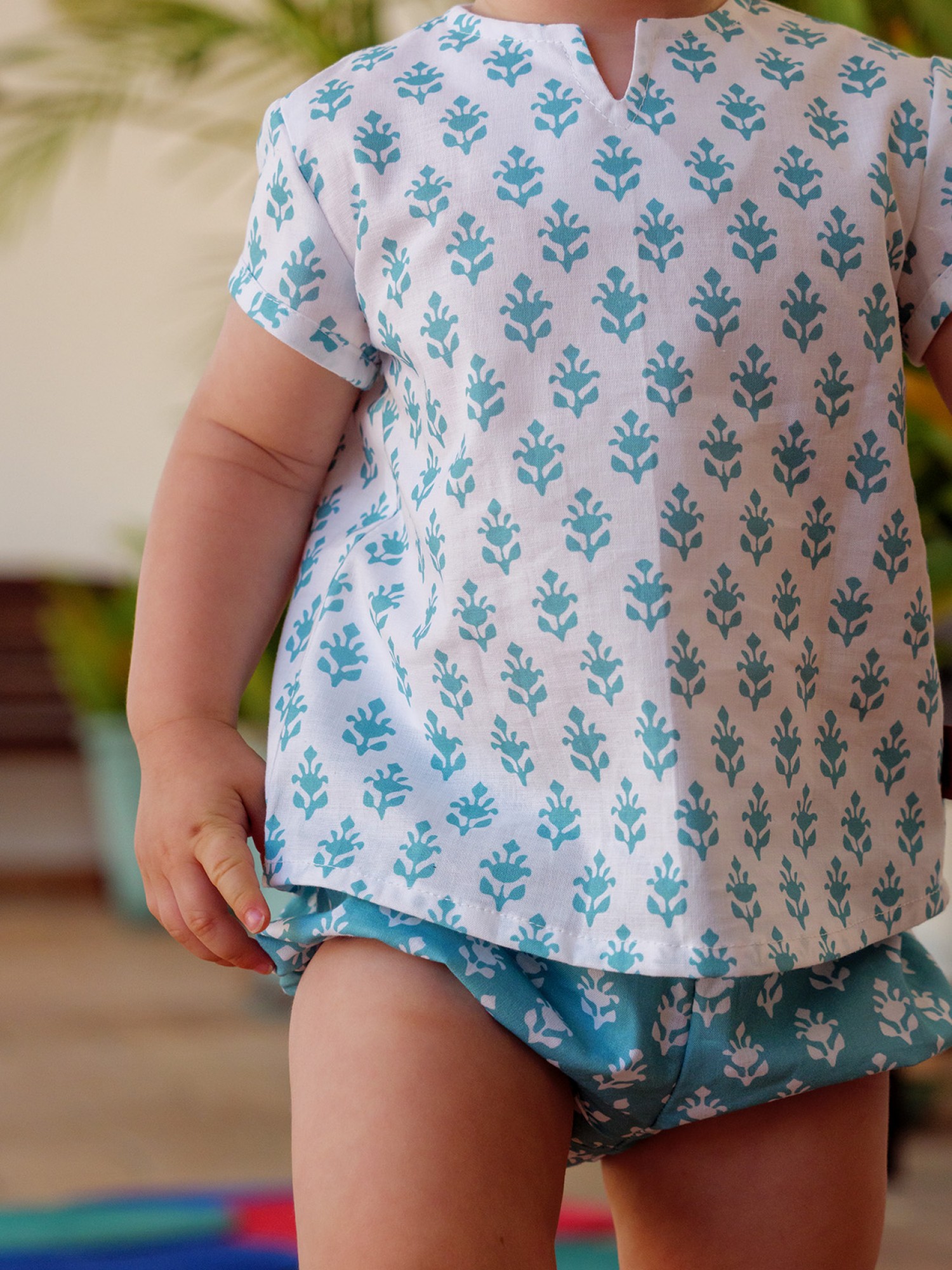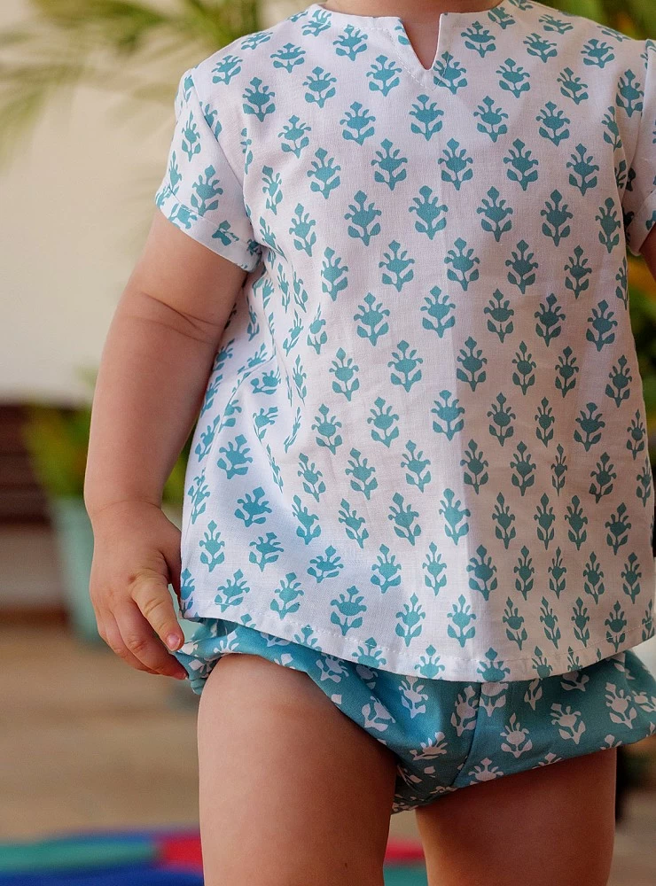 Blusa y bombachito de popelín con estampado etnico, blusa fondo blanco y estampado turquesa y el bombachito al contrario, fondo turquesa y estampado en blanco. Chulisimo