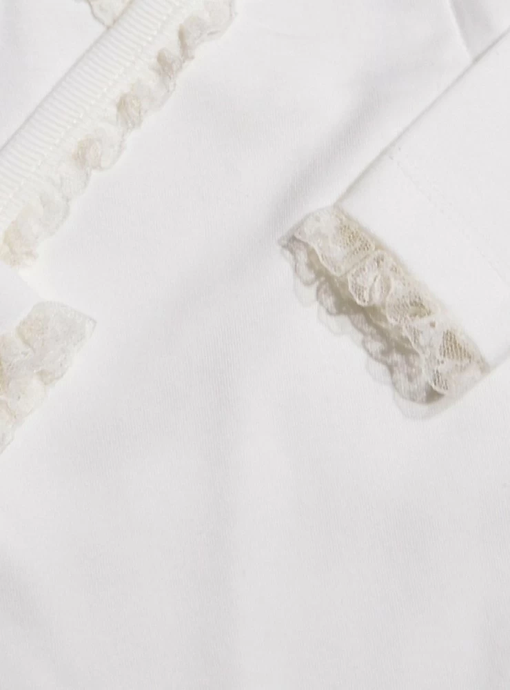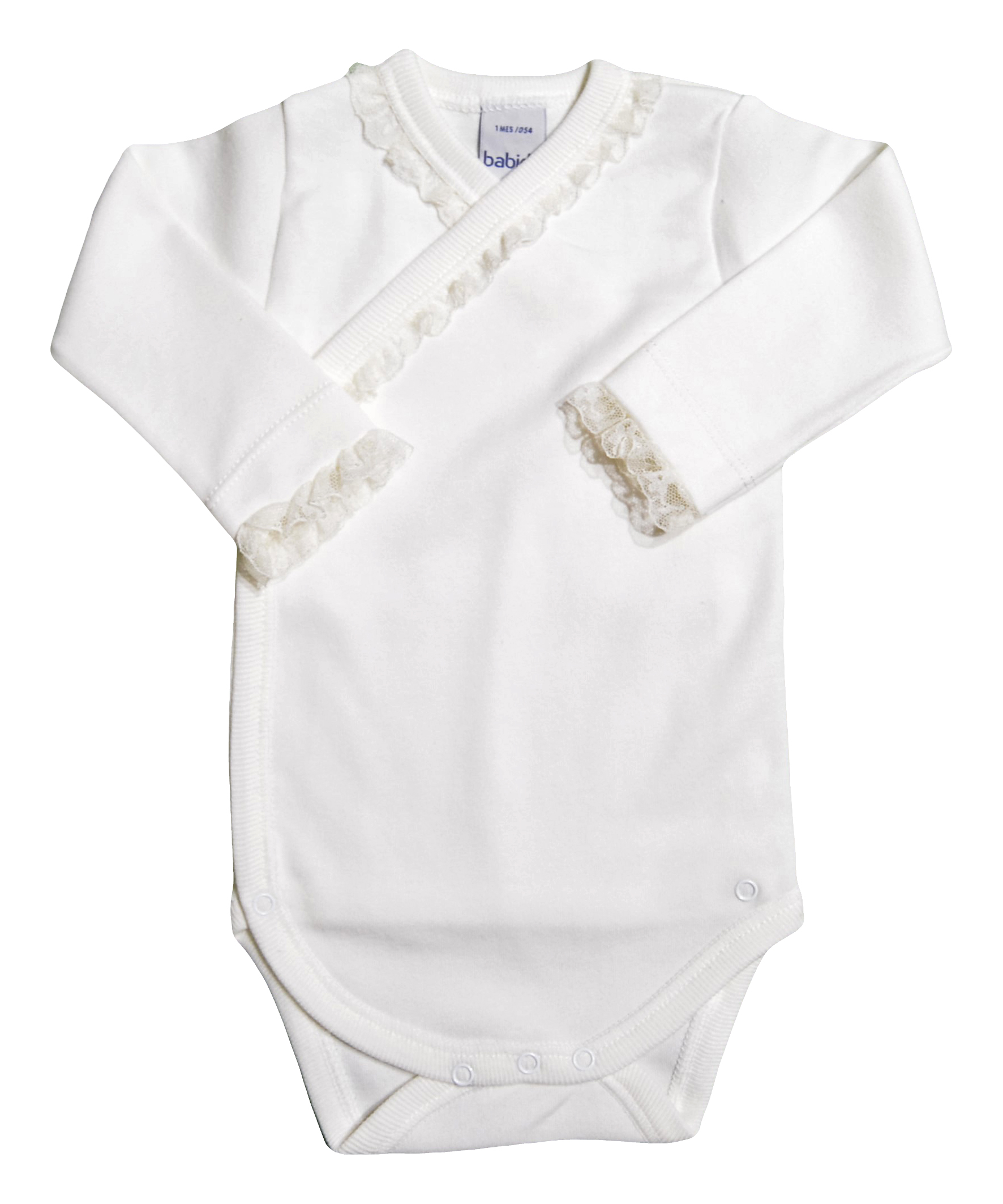 Es de algodón 100 % rematado en cuello y puños con puntilla valenncie en el mismo tono Es cruzado y de manga larga. unisex
