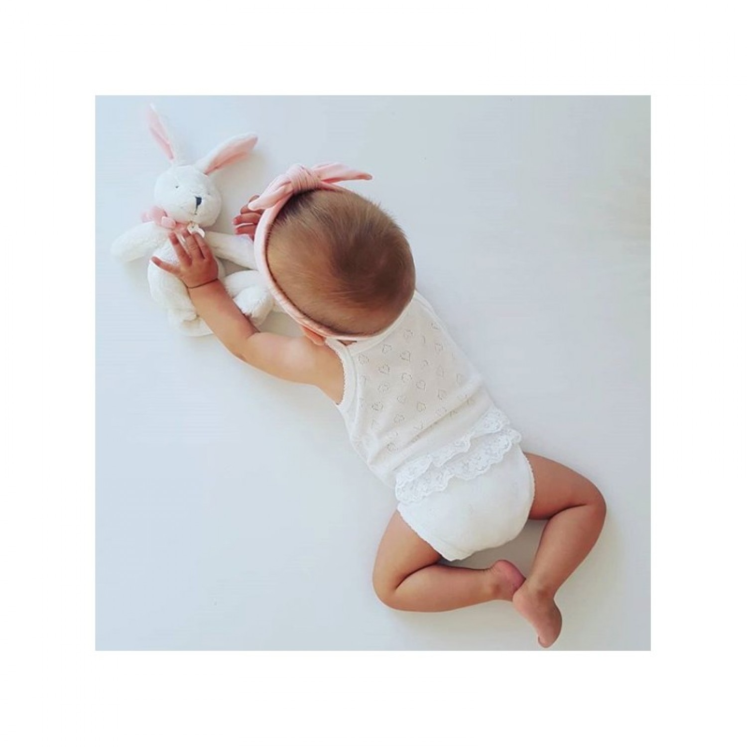 Lleva tirante fino y volantes en tejido calado en forma de corazones.