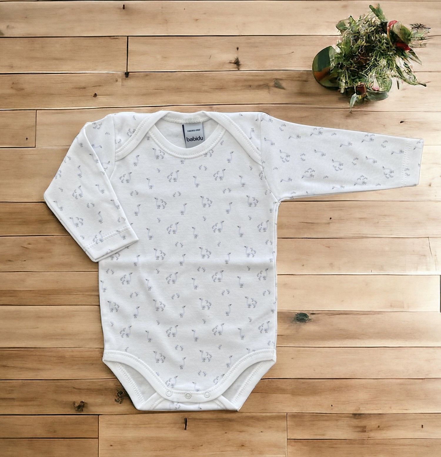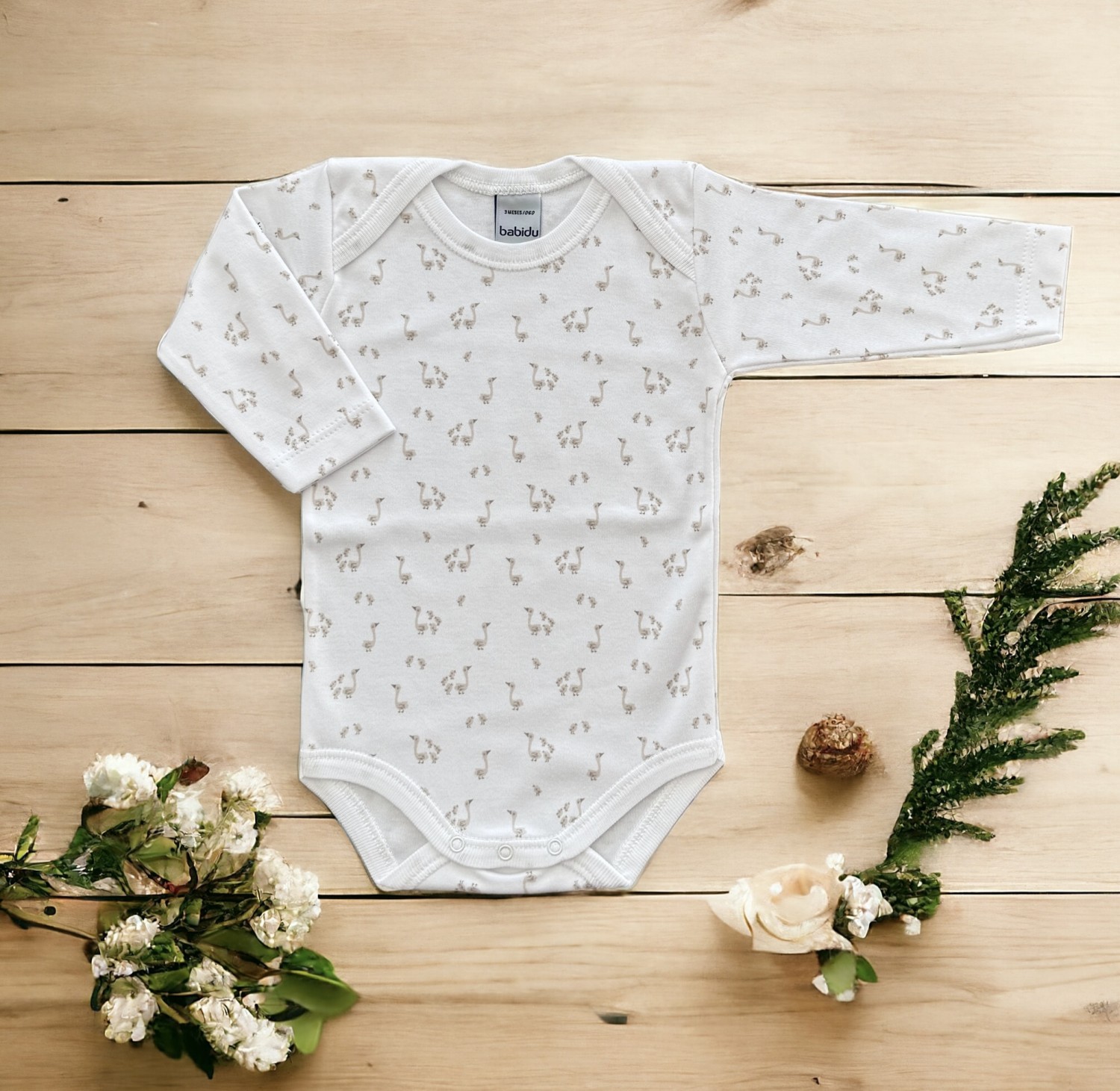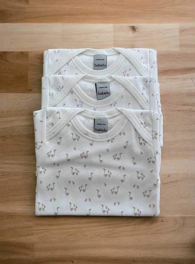 Confeccionado en algodón 100 %. Fondo blanco con estampado patitos en tres colores. Cuello americano.