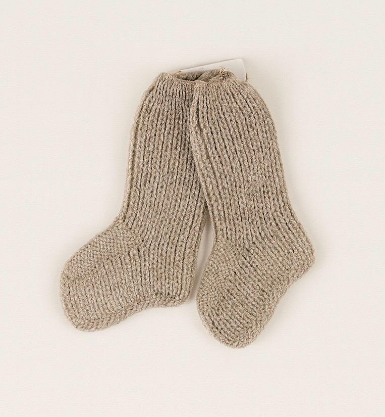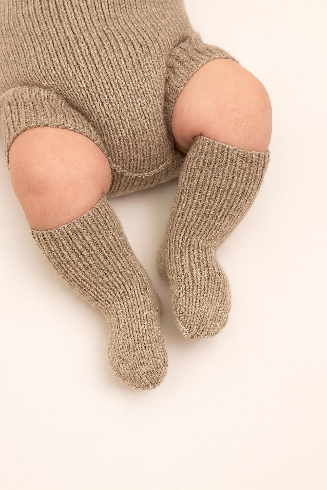 Calcetines largos confeccionados en lana merino italiana, en un elegante color arena. Suave, cálido y muy agradable al tacto, ideal para mantener los pies del bebé abrigados durante los meses más fríos.