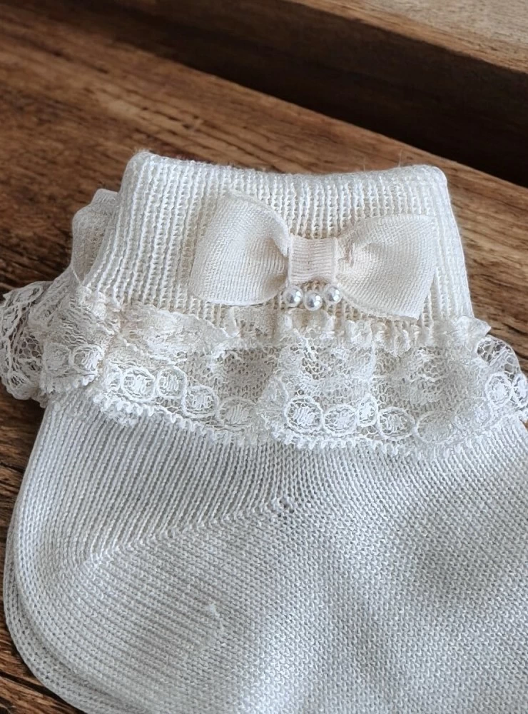 Son de ceremonia para niña con el puño vuelto y acabado de puntilla y lazo.