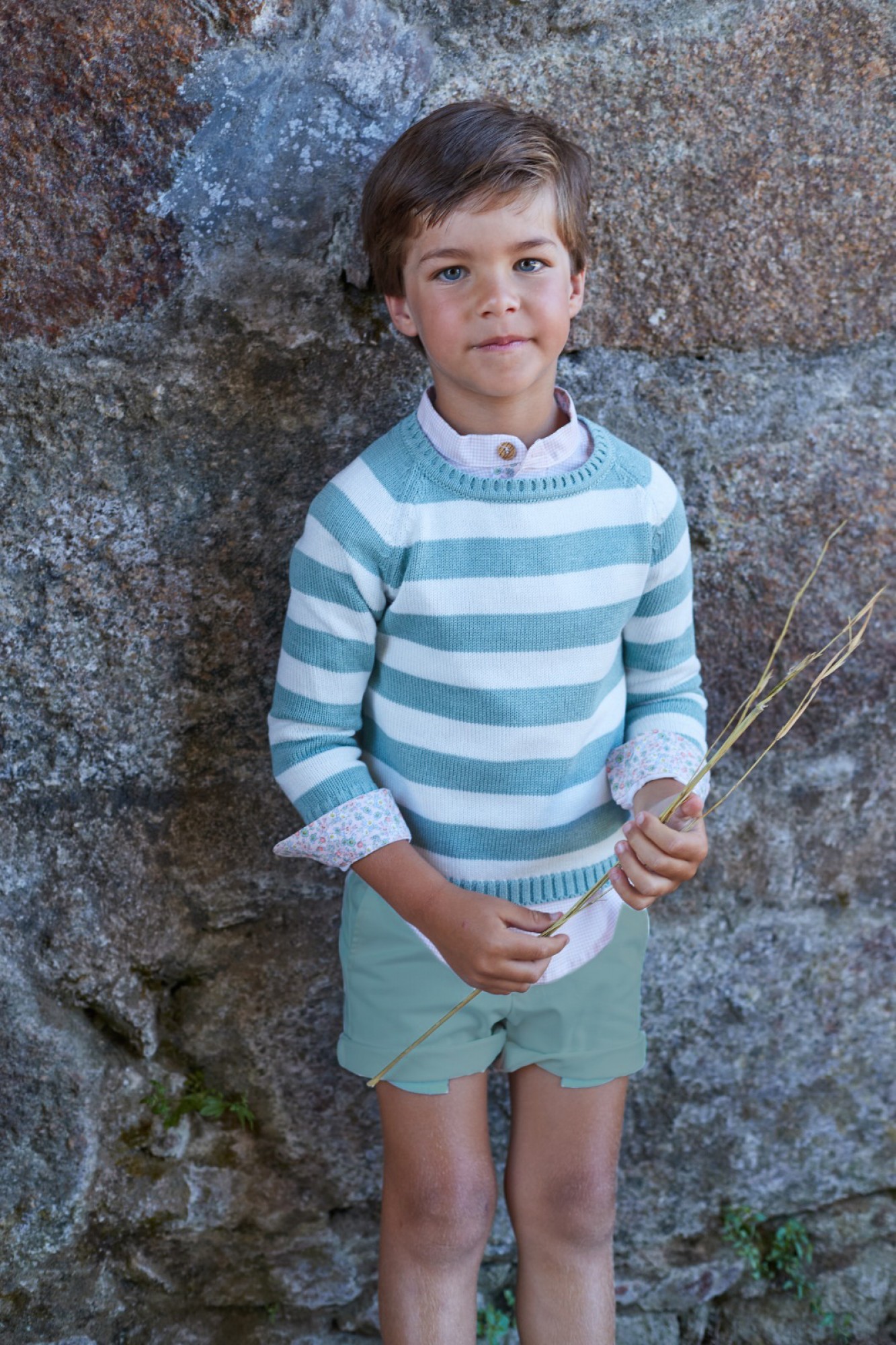 Camisa con pantalón y jersey. La camisa es de cuadrito vichy rosa palo con el pantalón de loneta en verde seco y jersey en punto de verano verde y blanco