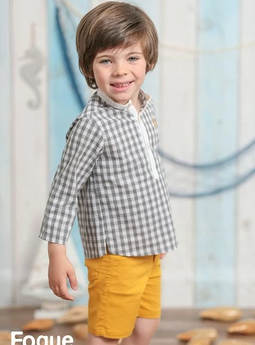 Confeccionado tejido de algodón con lana en cuadros marino y marrón.