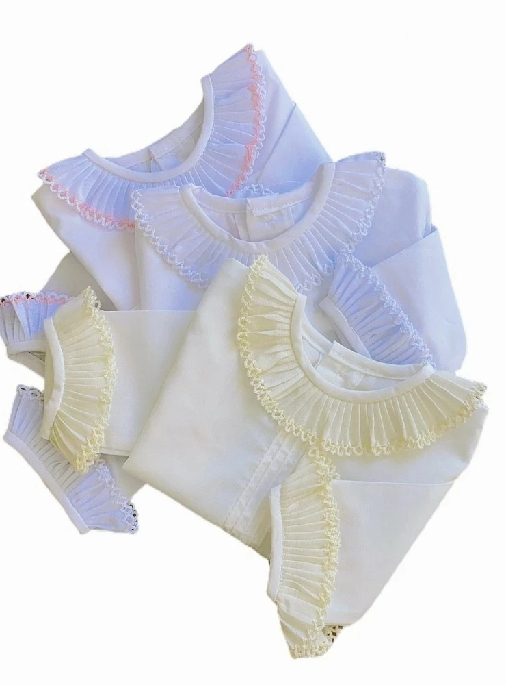 Camisa de batista blanca con puntilla tableada en cuello y puños Es monísima y perfecta para primeras puestas Colores: toda beige, toda blanco o blanco con celeste y blanco con rosa