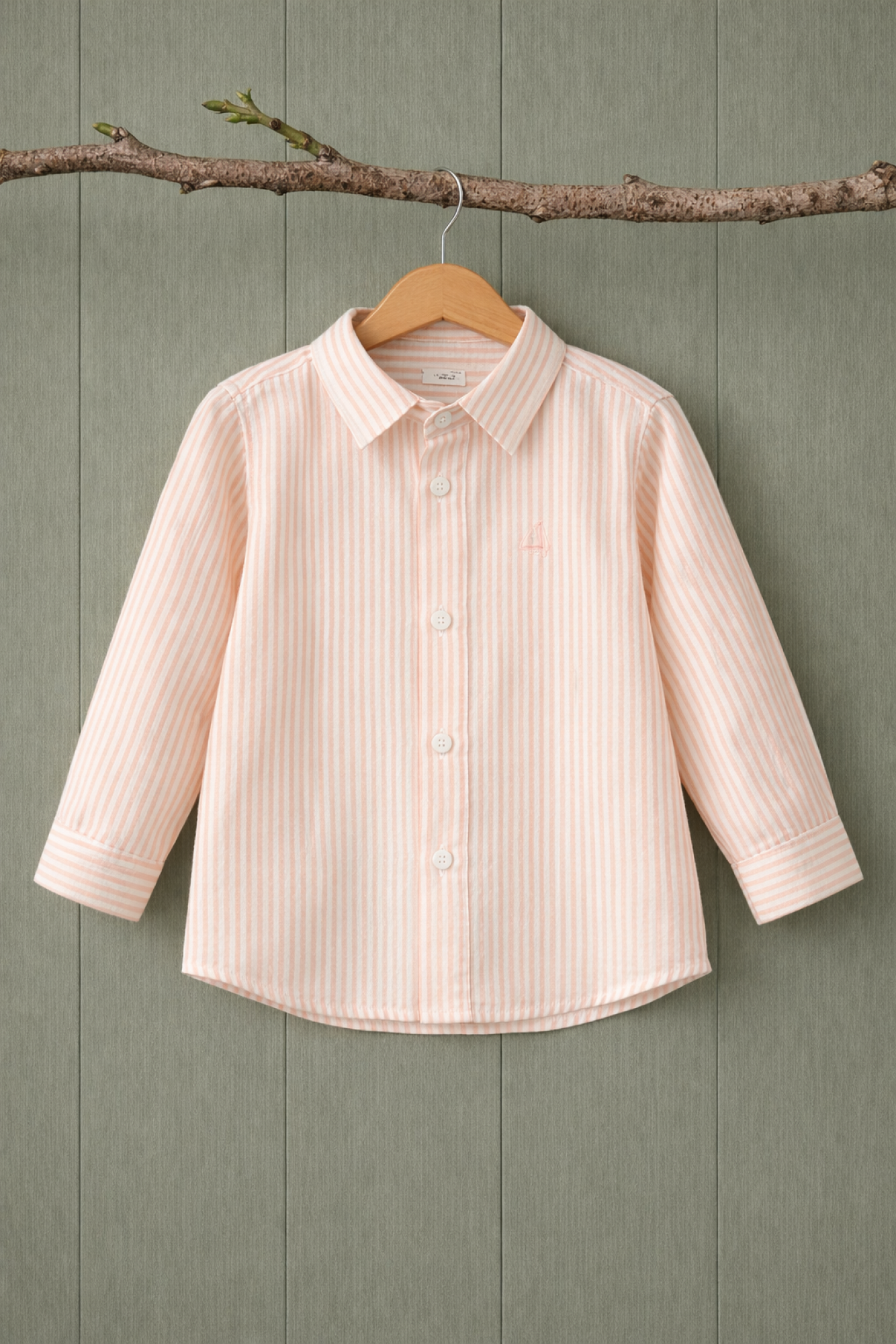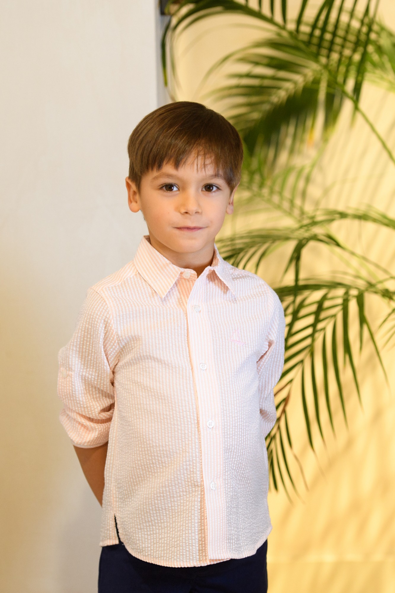 Camisa para niño confeccionada en algodón ligero con textura ligeramente arrugada tipo seersucker, en tono rosa palo con fina raya vertical blanca.
