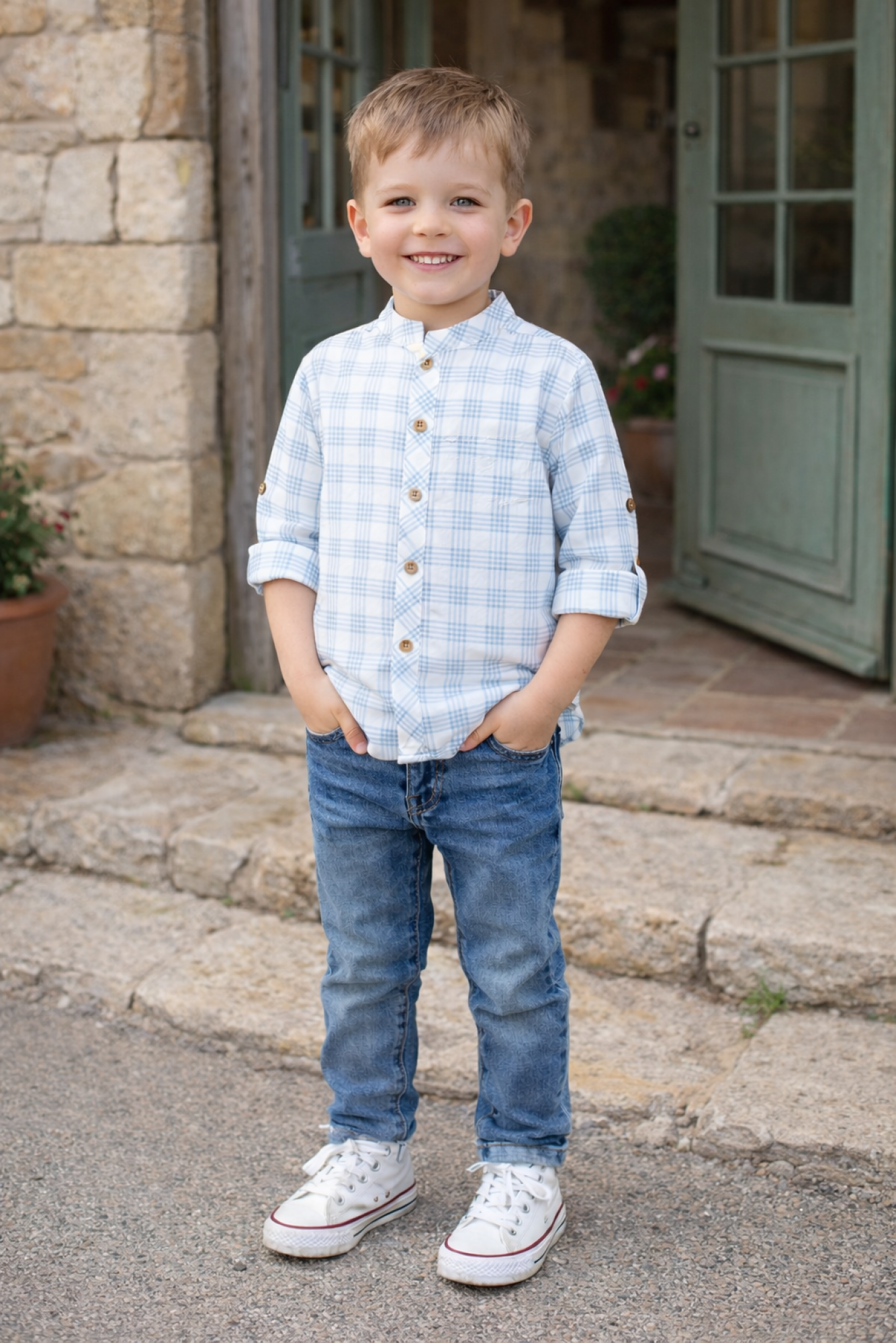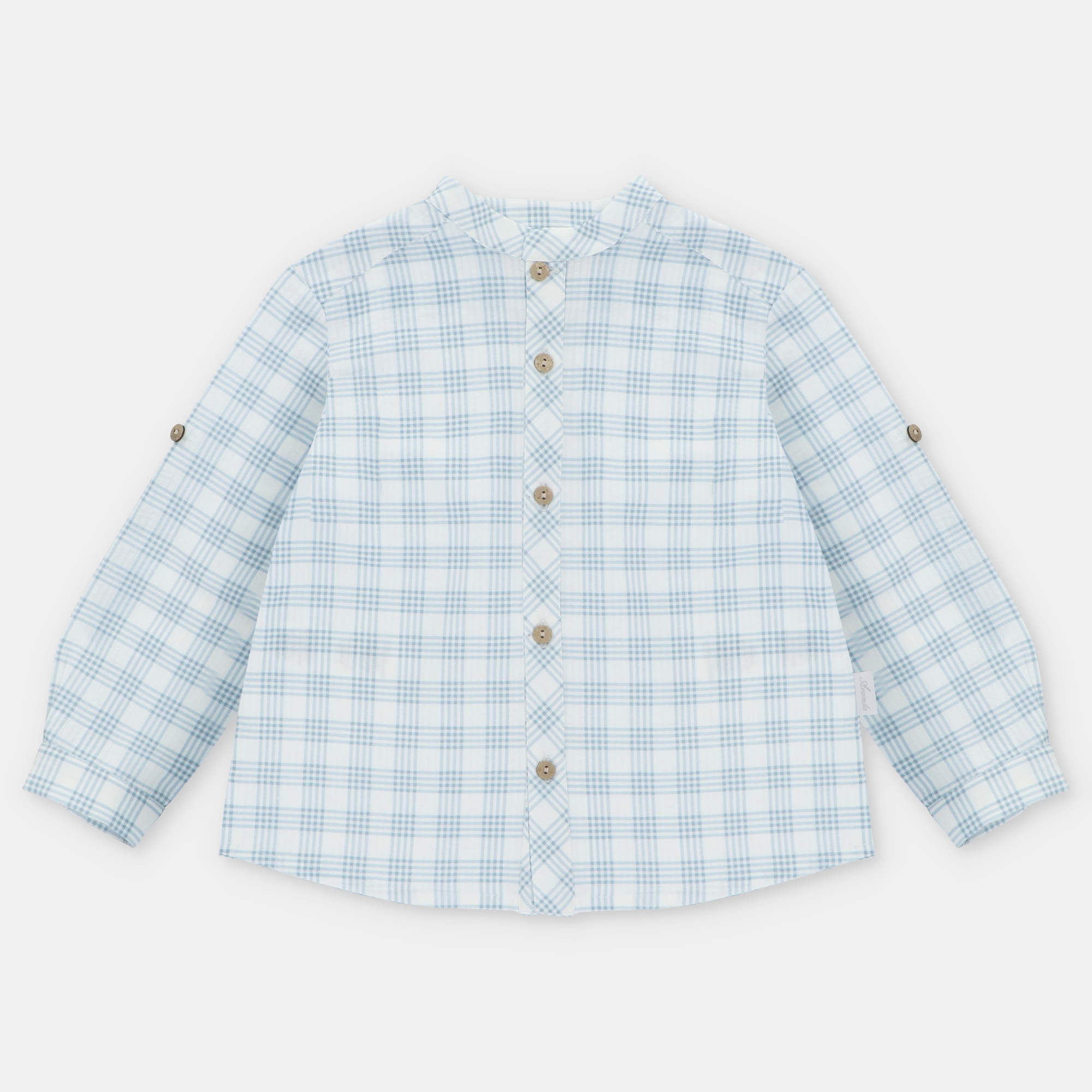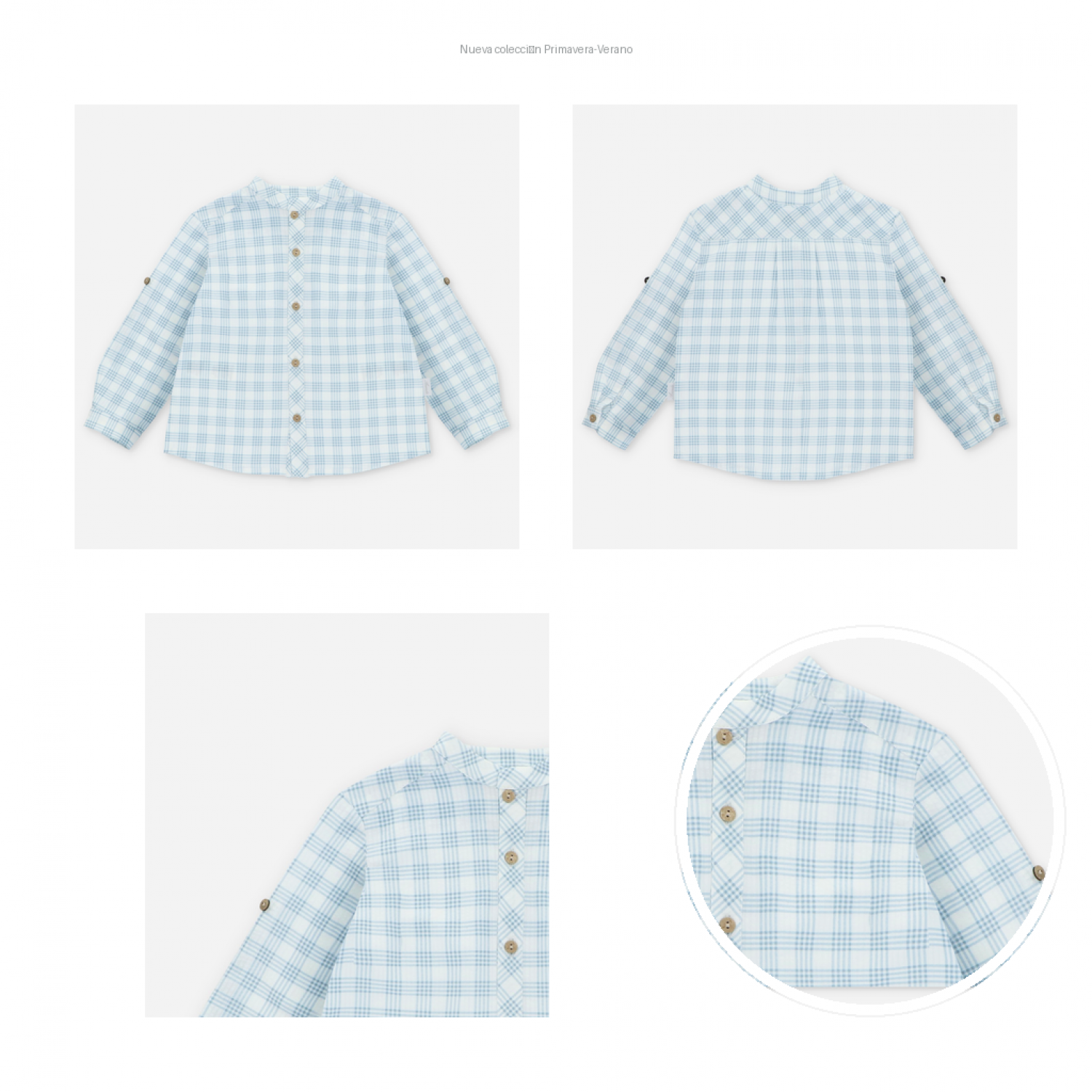 Camisa infantil confeccionada en tejido de algodón 100 % con estampado de cuadros en tonos azul suave sobre fondo claro, fresca y ligera para la temporada.