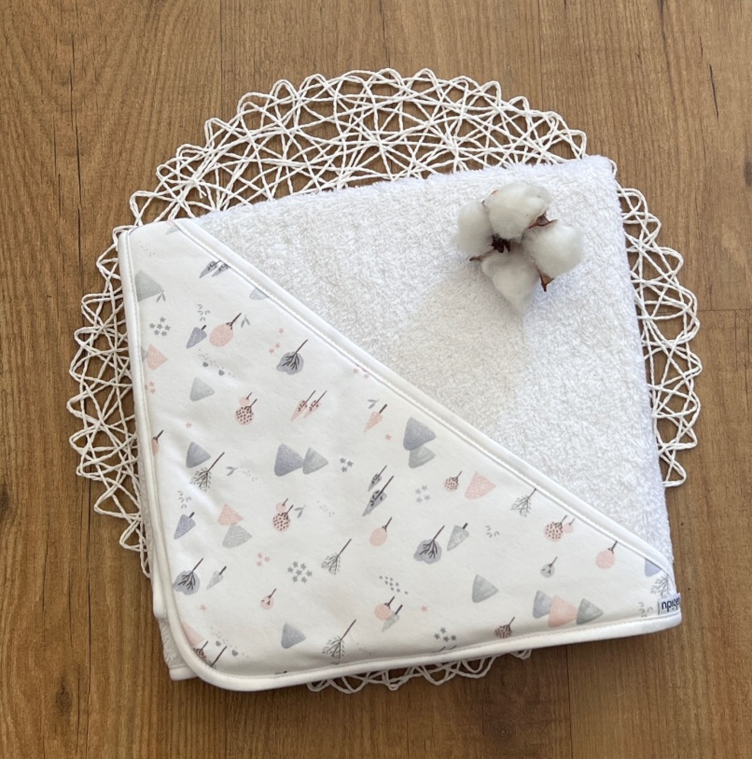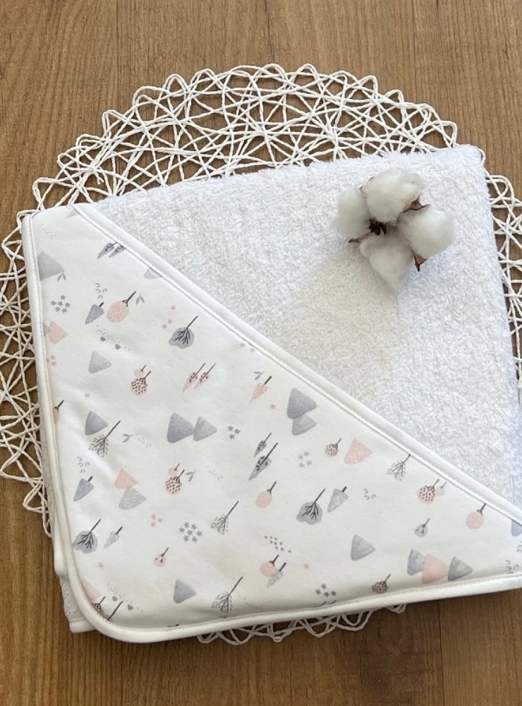 Es de rizo blanco de 1 metro x 1 metro aprox. Lleva pico para hacer la capa en estampado arbolitos en rosa o azul empolvado. Muy original
