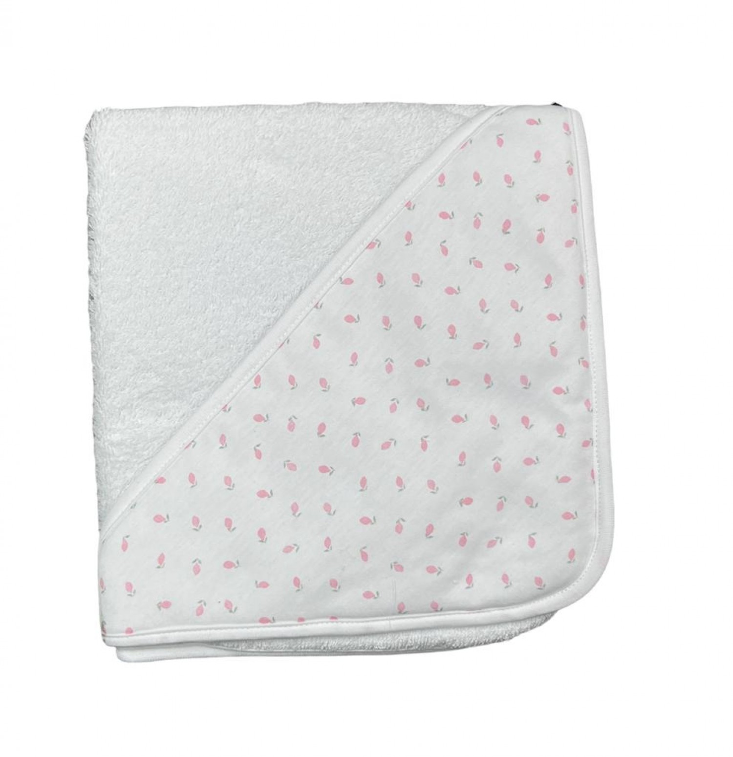 Rizo blanco con esquina de algodón en blanco con estampado limones en azul plomo o rosa.