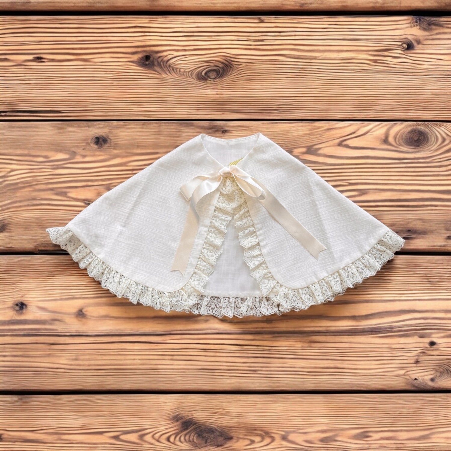 Confeccionada en lino natural color beige con remate de puntilla valenncie y lazo de raso en el mismo tono