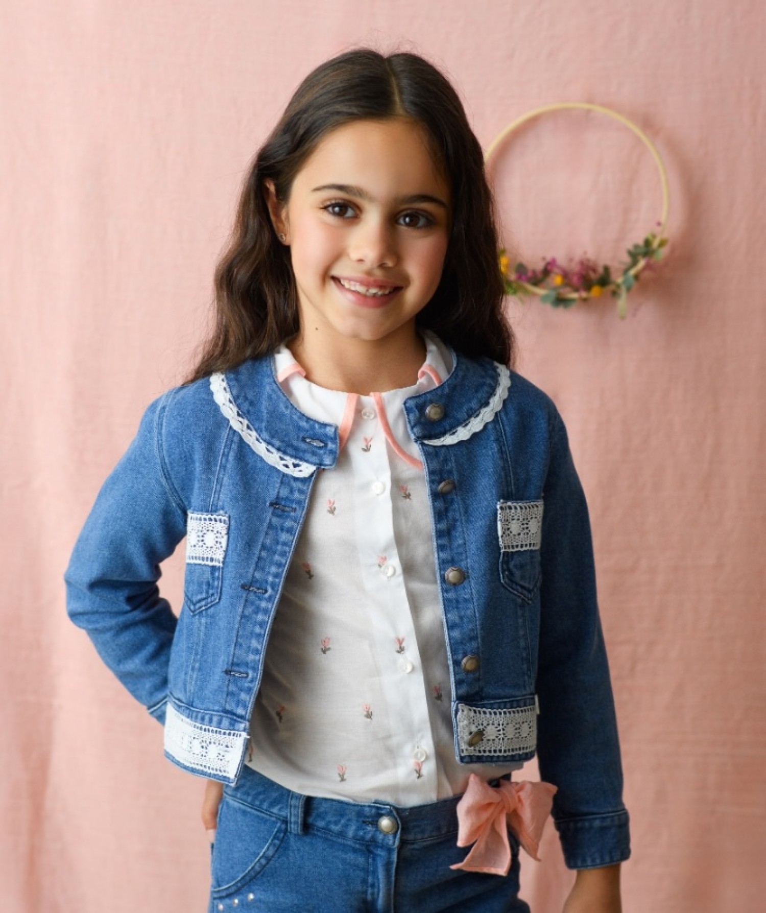 Chaqueta para niña confeccionada en tejido denim azul medio, suave y flexible, perfecta para completar cualquier look de primavera y verano.