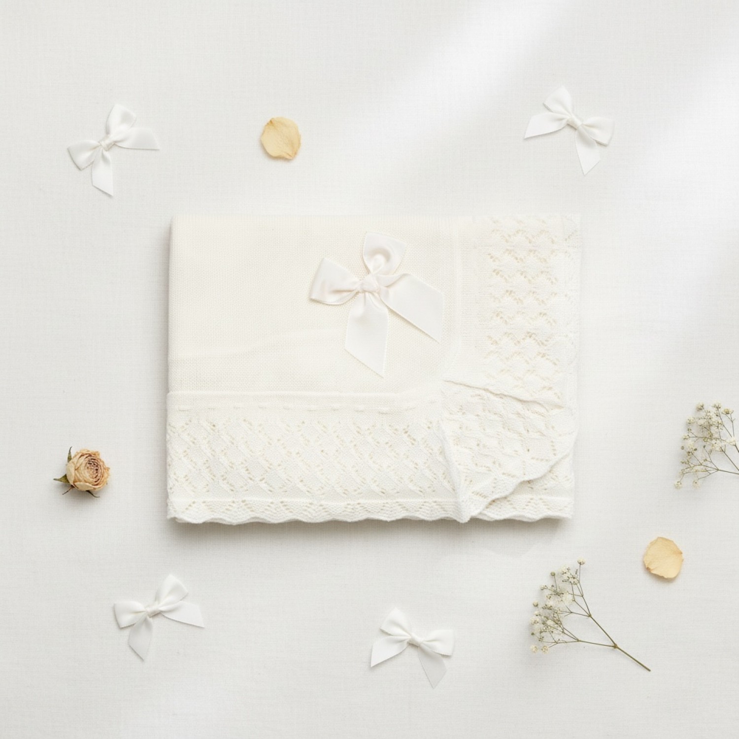 Confeccionada en punto ligero y delicado, con cuerpo central liso y amplios bordes calados con dibujo ornamental que aportan un acabado elegante y muy trabajado. Incorpora lazada central a tono que realza el conjunto con un toque clásico.