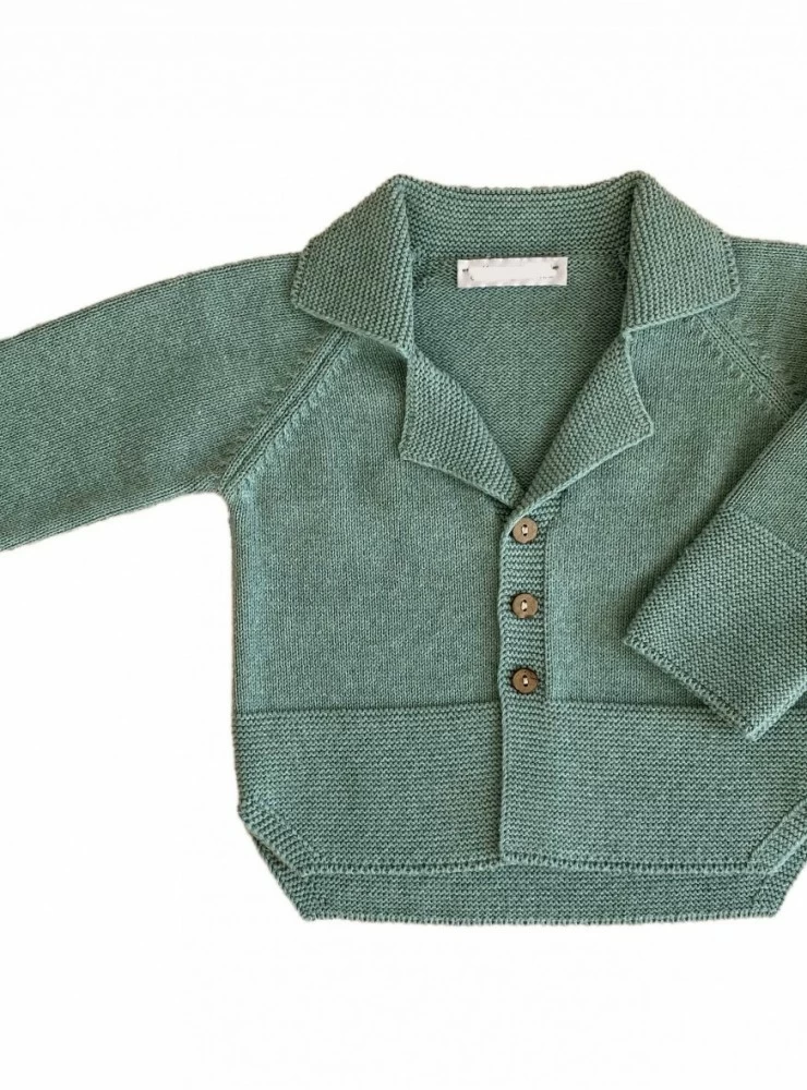 Chaqueta de niño confeccionada en punto de algodón 100 % en color verde empolvado. Es larga para usar en conjuntos de dos piezas. Lleva por debajo de la cintura aprox. Es muy bonita y perfecta para combinar con cualquier conjunto.