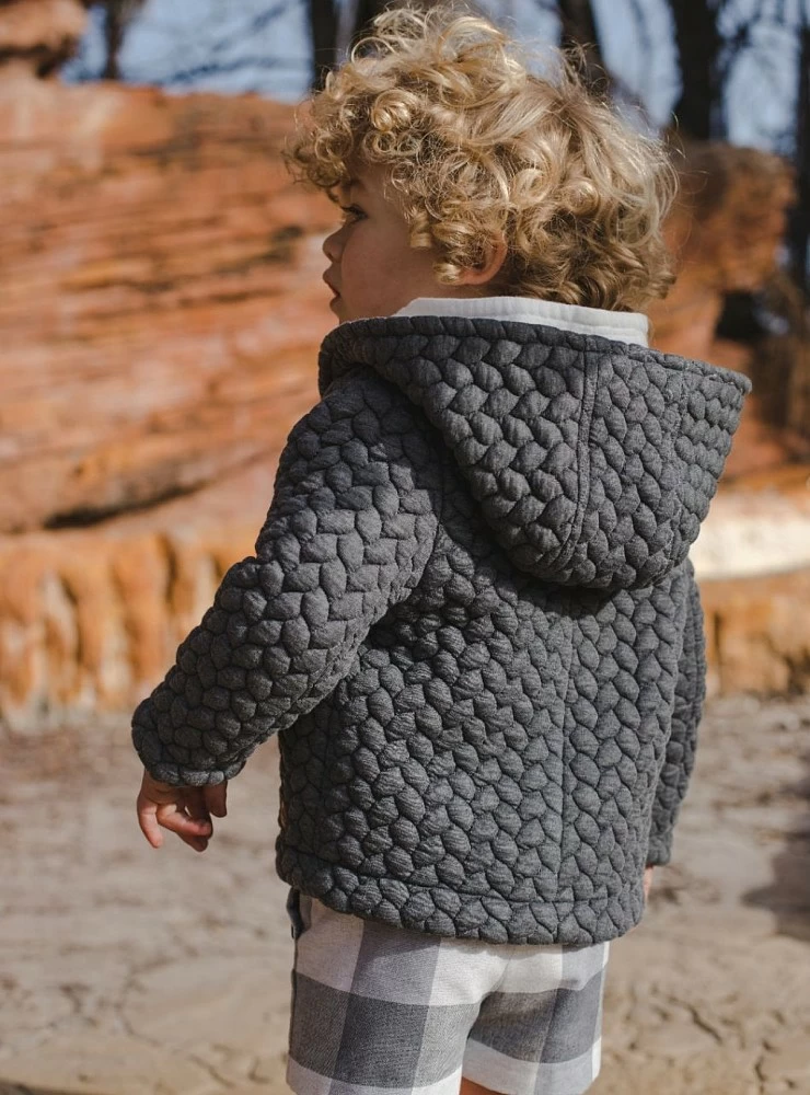 Confeccionada en tejido acolchado muy abrigadito y con el interior sarga de cuadros vichy en gris. Botón de bellota en madera