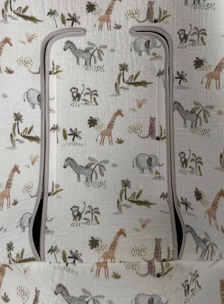 Confeccionada en muselina con fondo crudo y animalitos de la selva en tonos verde, gris y camel. lleva la parte de abajo en polipiel gris para una mejor vejez con la rozadura del calzado