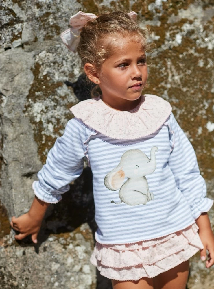 Camiseta de algodón a rayas en gris y blanco con un bonito elefante, lleva cuello volante en bambula rosa con corazones en gris a juego con la braguita de volantes. Son dos piezas. Camiseta y braga
