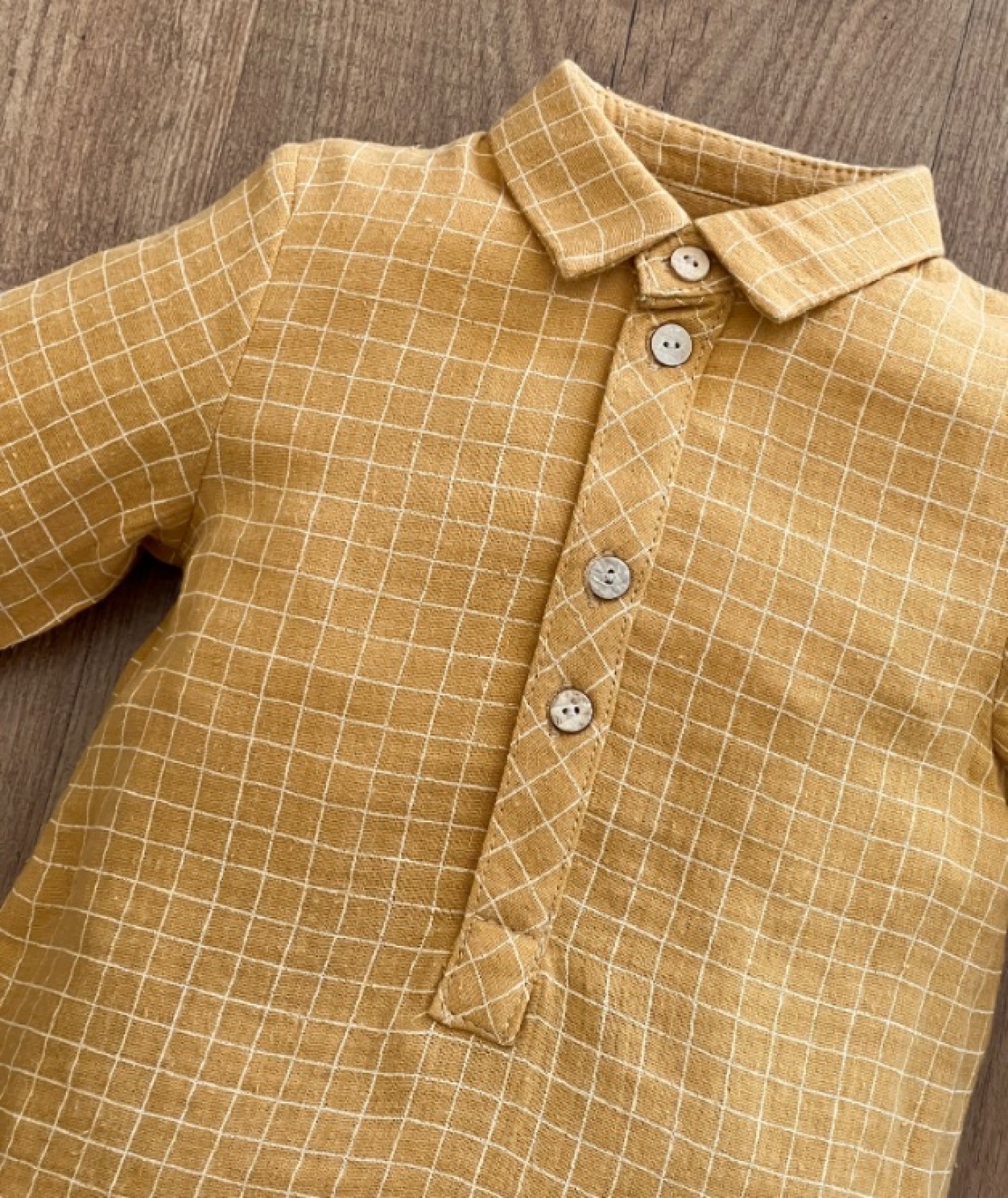La blusita es de muselina color mostaza con dibujo haciendo cuadrito. Lleva pantalón turquesa.