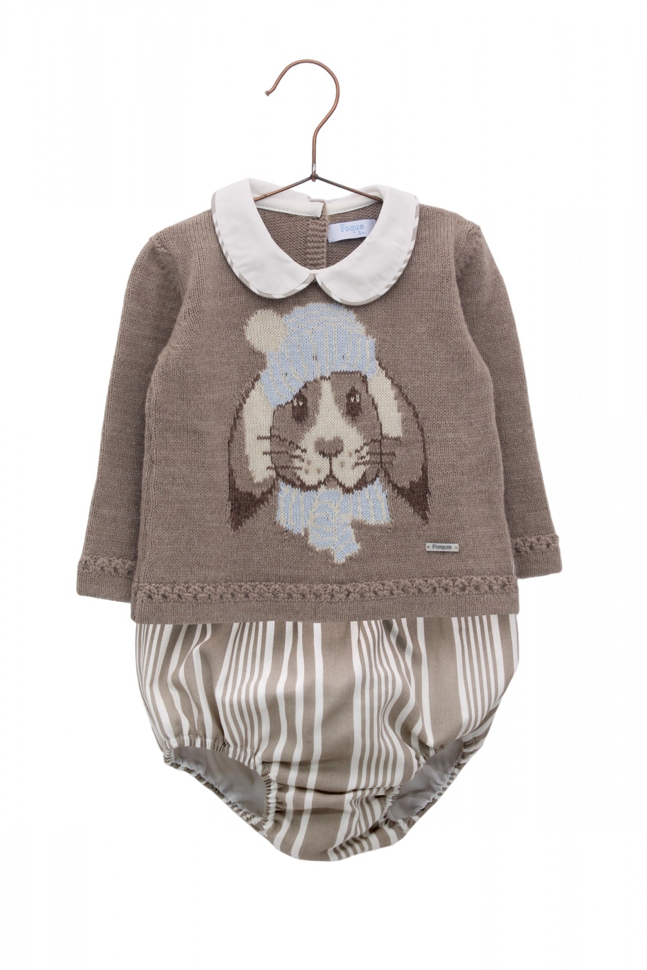 Jersey color topo con un bonito conejito. Bombachito en viella de rayas en tonos tostados y beige.