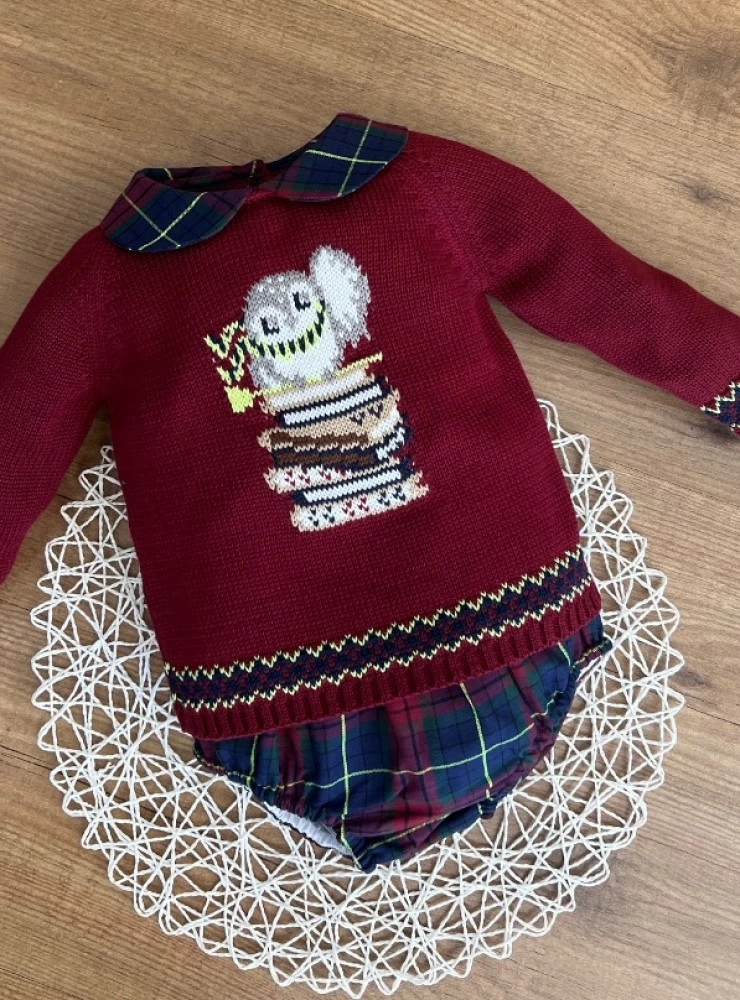 Jersey en un tejido de punto muy similar al algodón ni pica ni hace bolas color burdeos con cuellos bebé en cuadros a juego con la braga. Marino, rojo y flúor. Lleva en el centro del jersey una lechuza de Harry Potter.