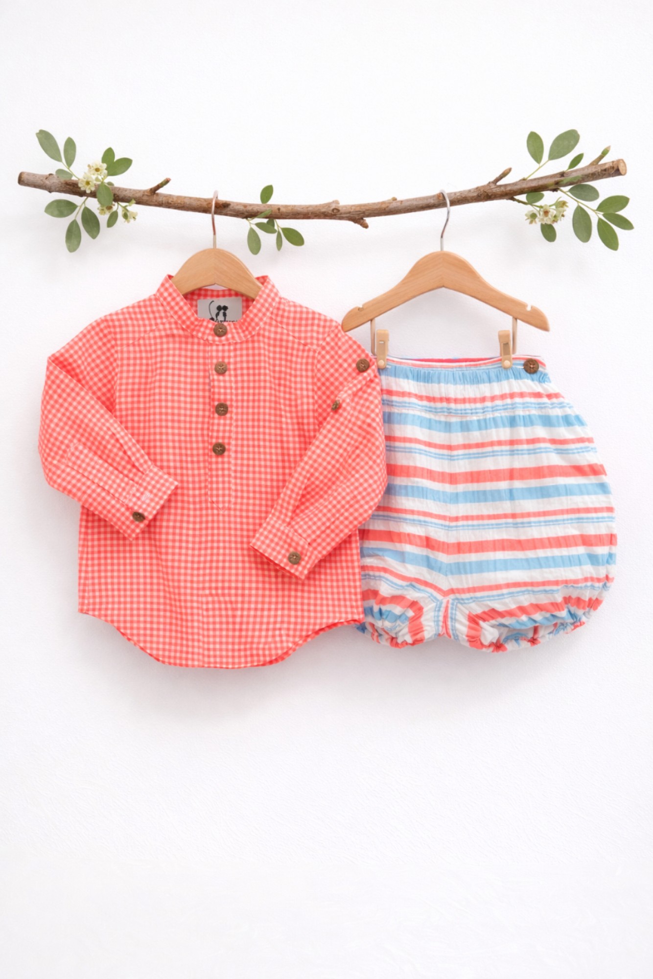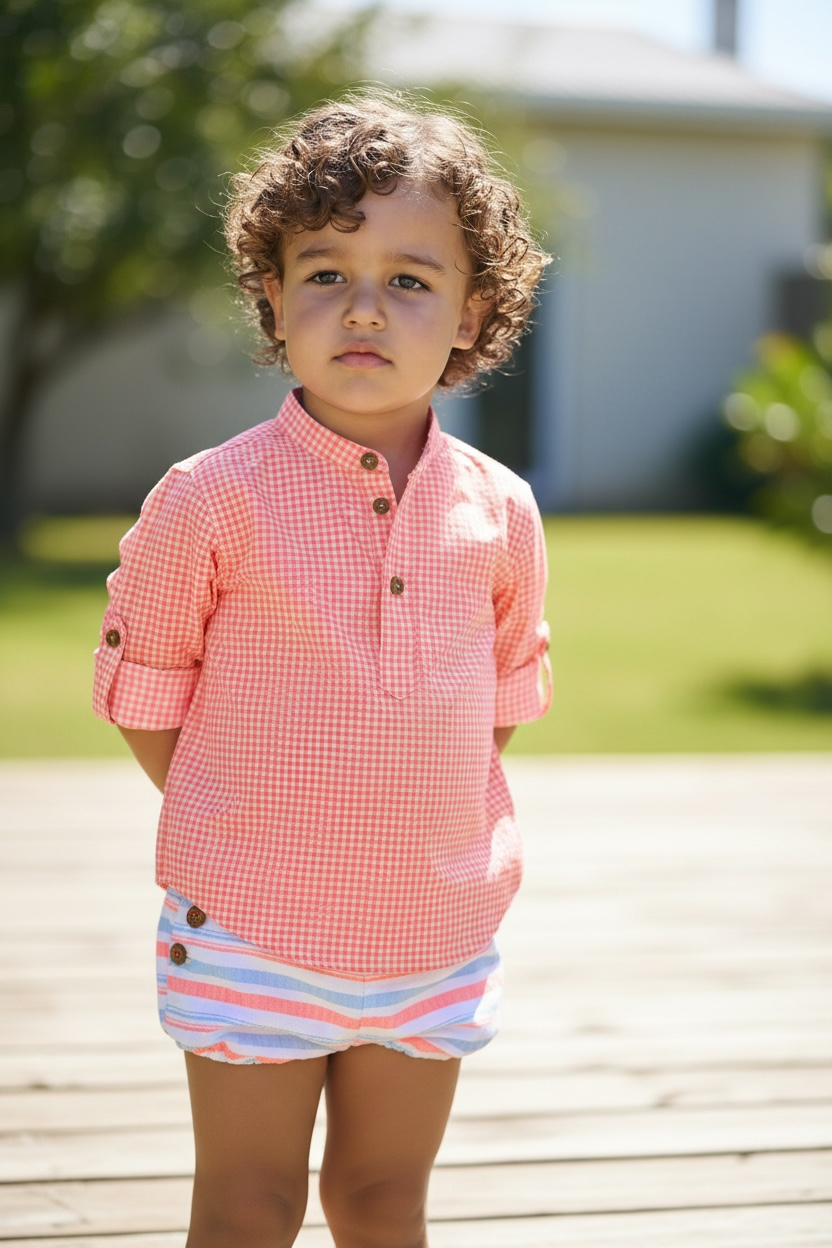 Conjunto de niño colección Bike compuesto por blusita de cuadro vichy coral y bombachito de rayas multicolor.