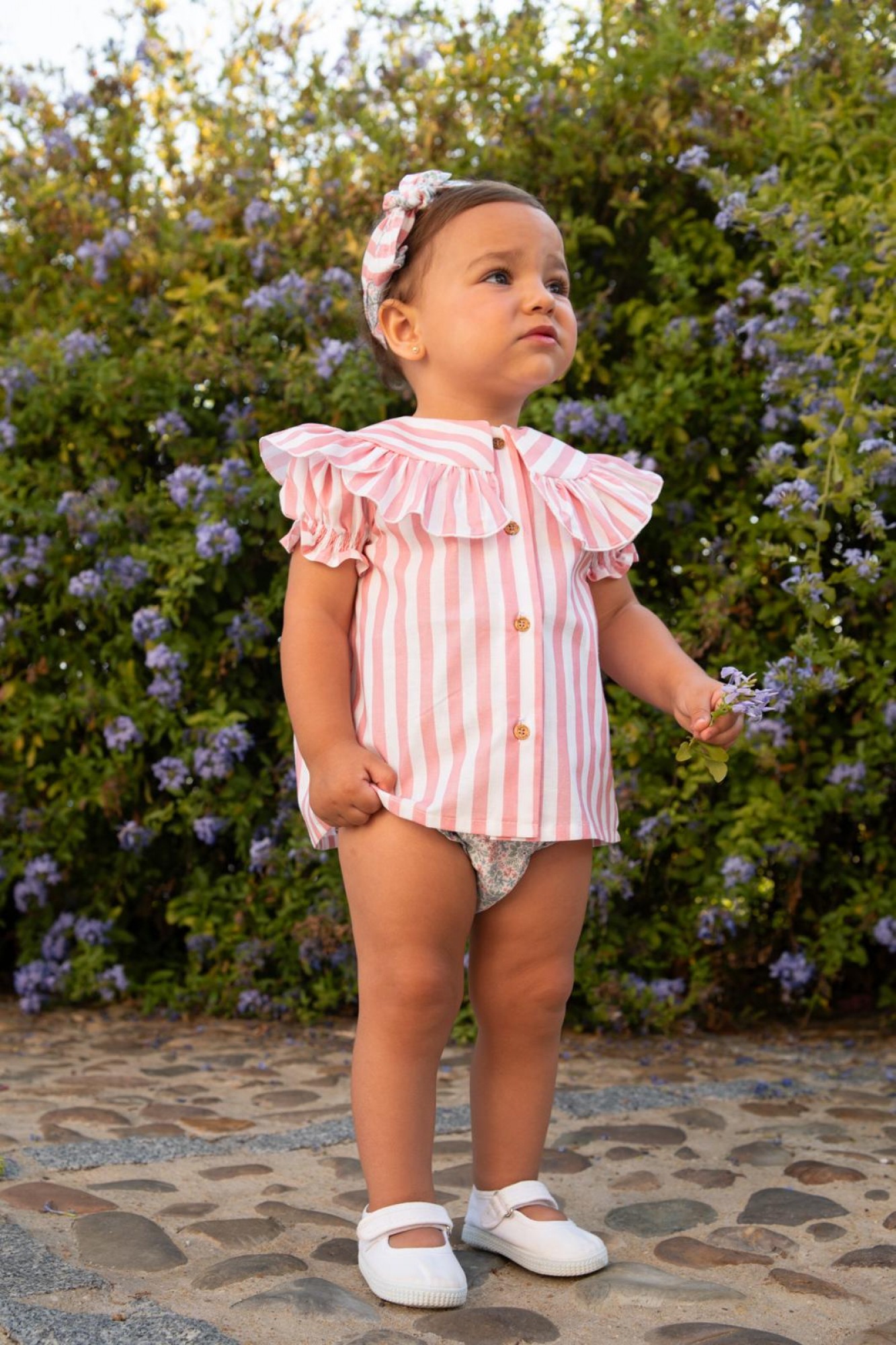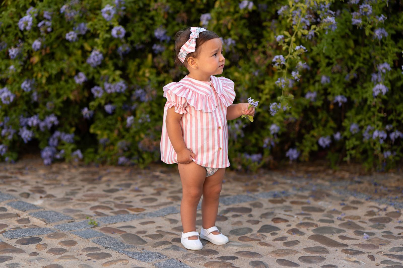 Conjunto de blusa con braga en una combinación muy dulce y delicada. La blusa está confeccionada en tejido de rayas verticales en rosa suave y blanco, un dibujo clásico y luminoso ideal para la temporada.