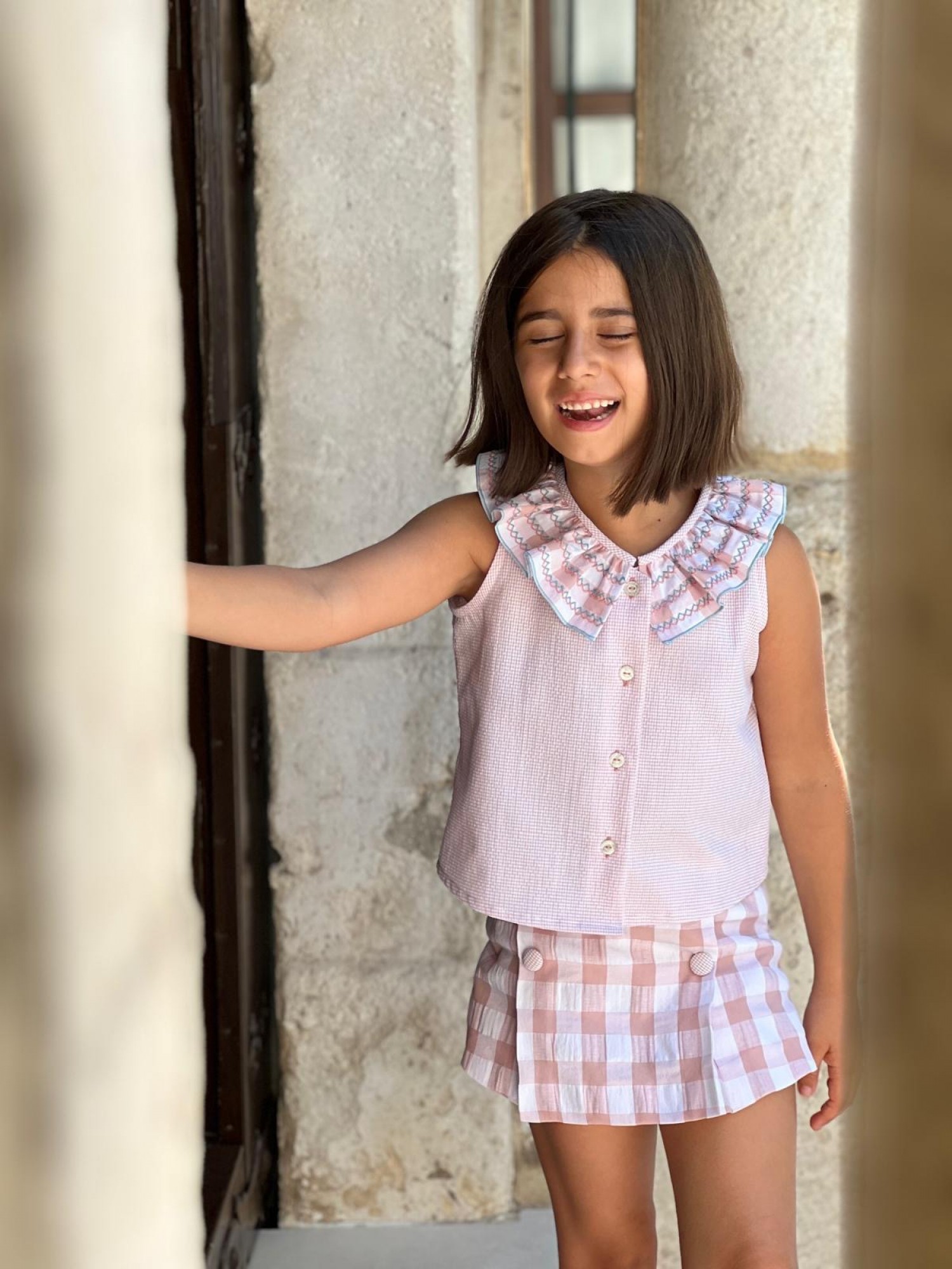 La falda pantalón combina cuadros grandes en rosa y blanco, con detalle de botones forrados que le dan un toque súper especial.