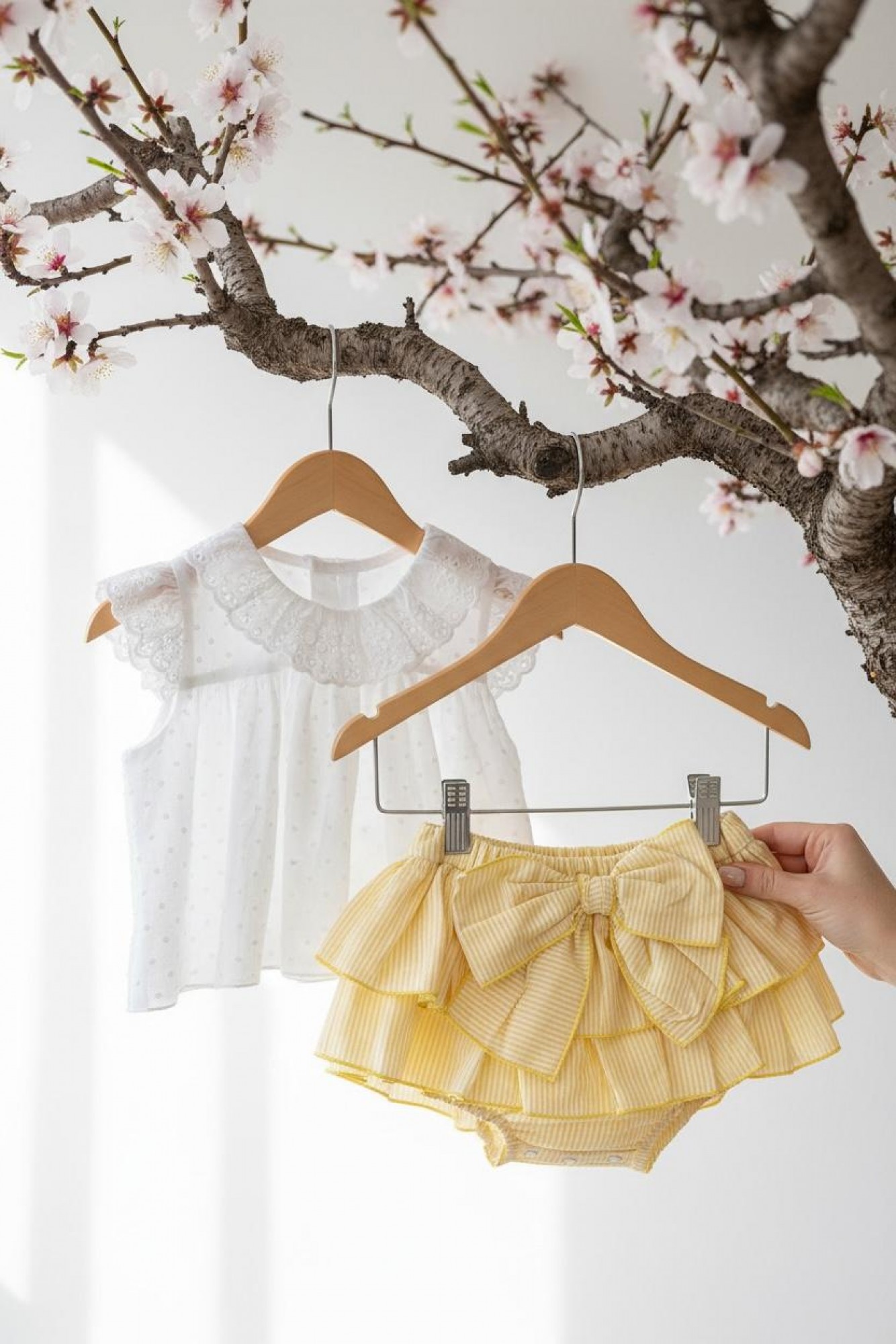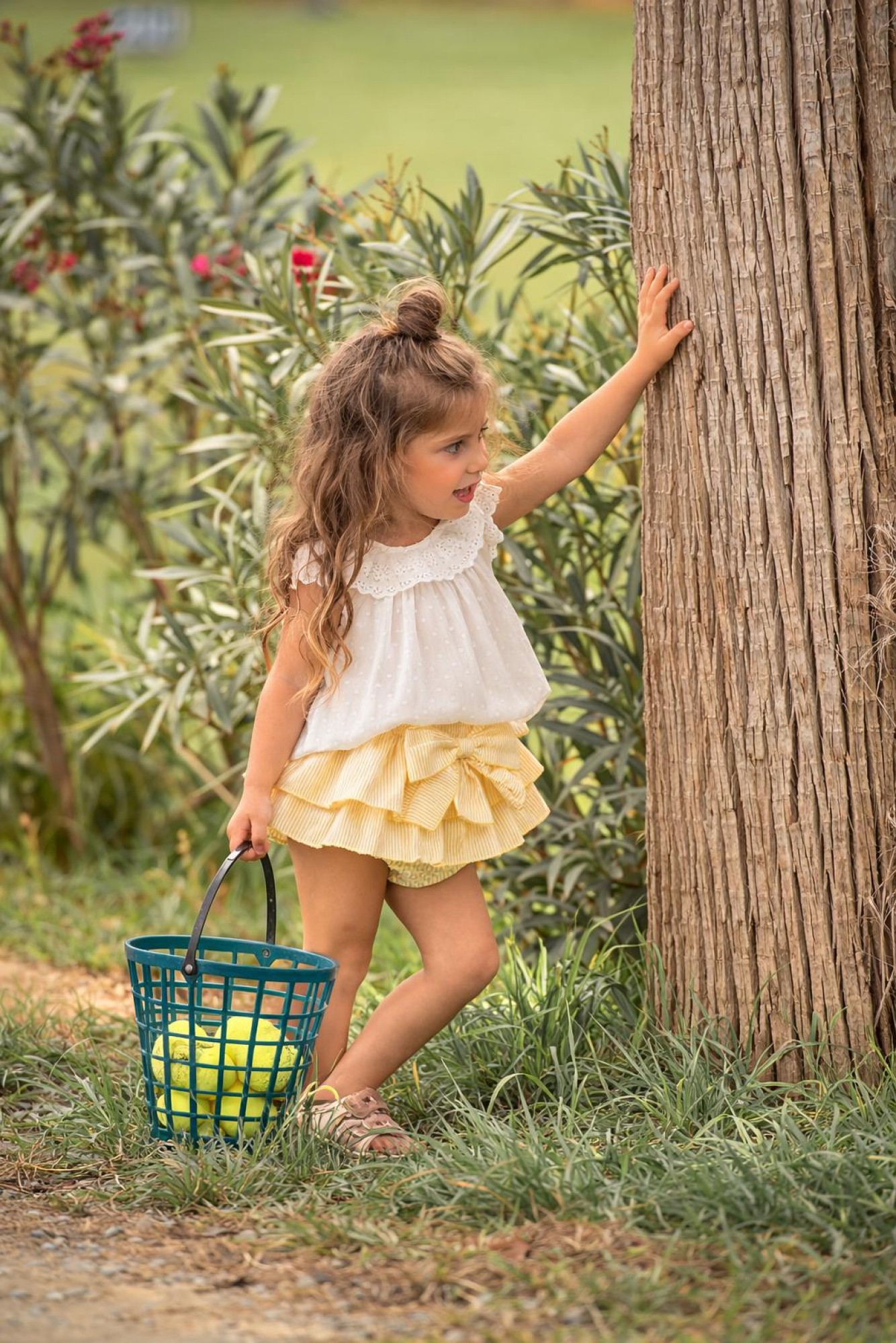 La braga falda está confeccionada en tejido de rayas finas en tono amarillo vainilla, con doble volante rematado en vivo amarillo. Lleva una gran lazada delantera que da mucho movimiento y convierte el conjunto en una monada.