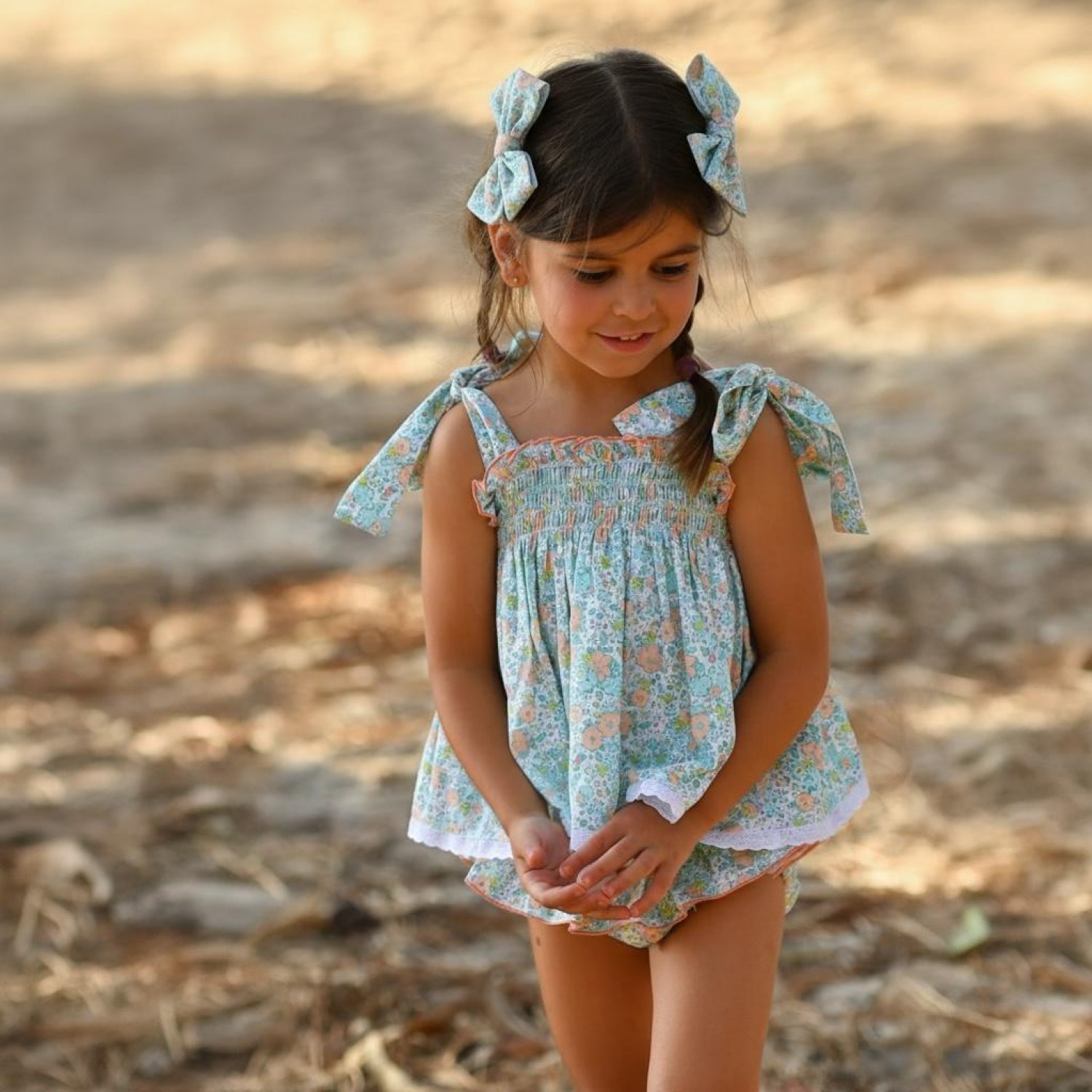 Conjunto para niña compuesto por blusón y braguita a juego, un conjunto fresco y muy dulce para los días de verano.