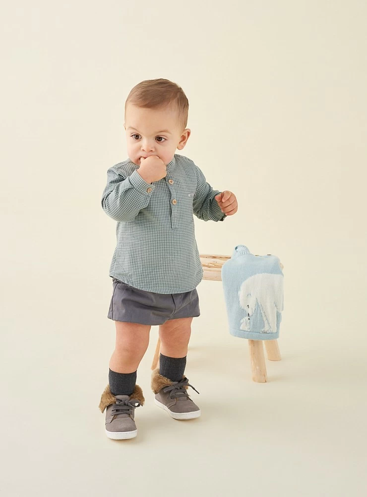 Camisa de viella con cuadrito vichy en gris y verde empolvado. Lleva cuello mao. Pantalón o bombacho de loneta en gris
